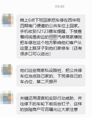 昨天,有西华苑 车主 向小编爆料,晚上下班后将车停在楼下路边的公共停车位,但是6点多接到公共车位旁商户的电话,禁止车主在门前停车,还进行了语言和行动上的威胁。