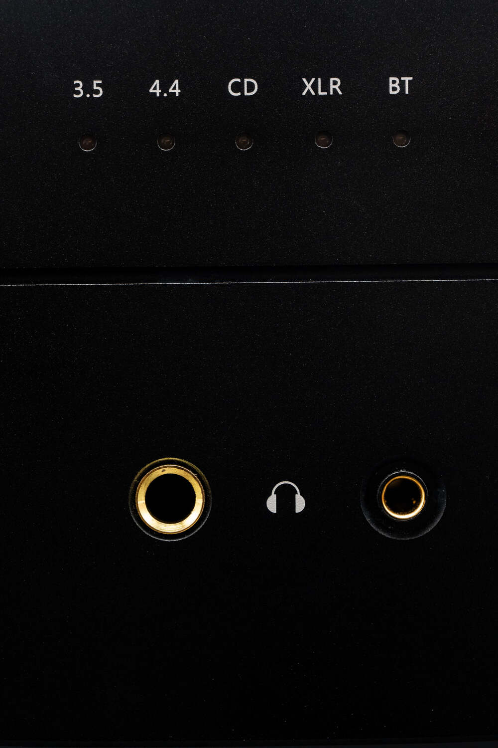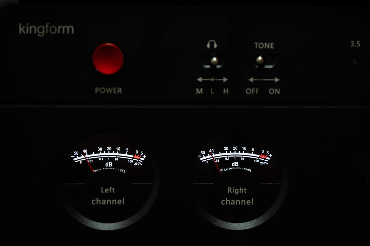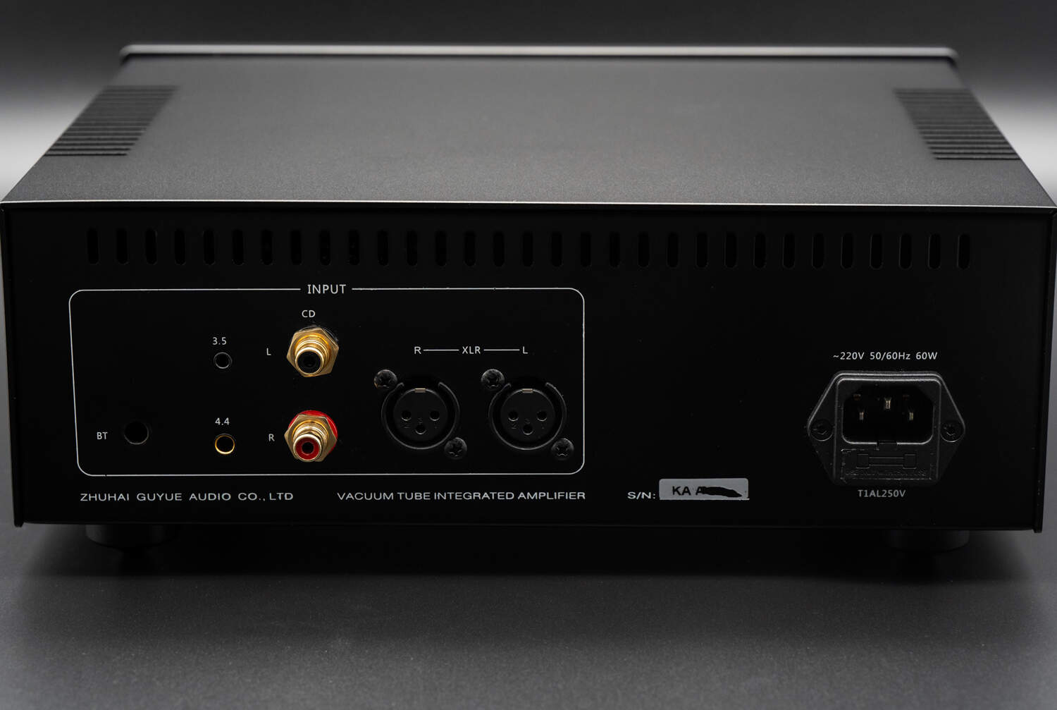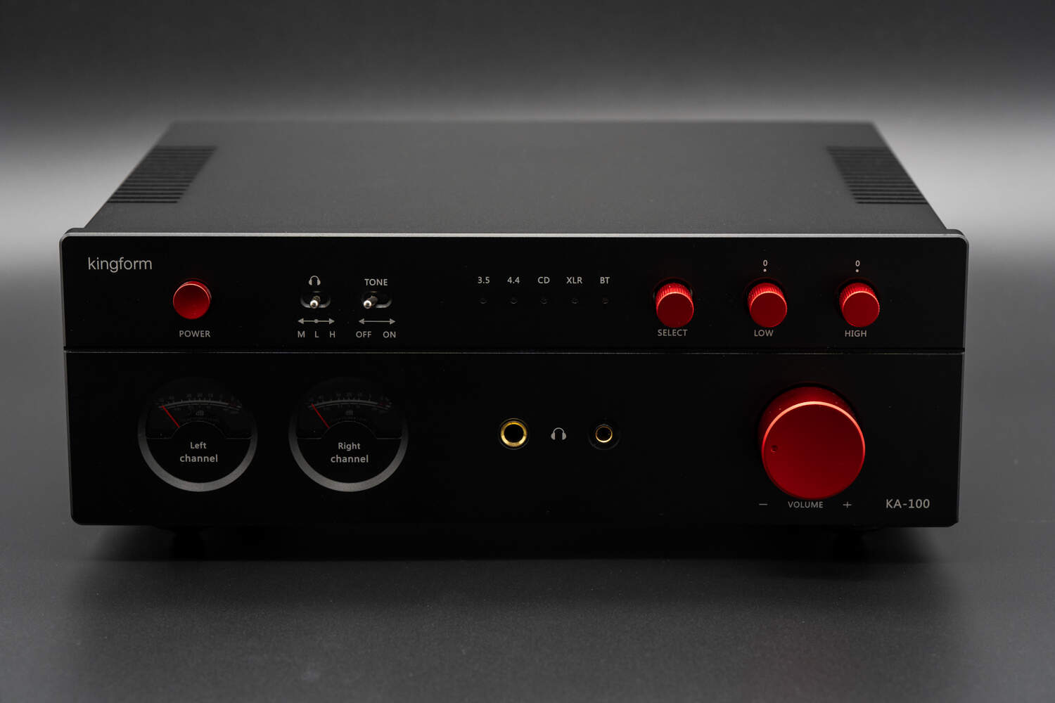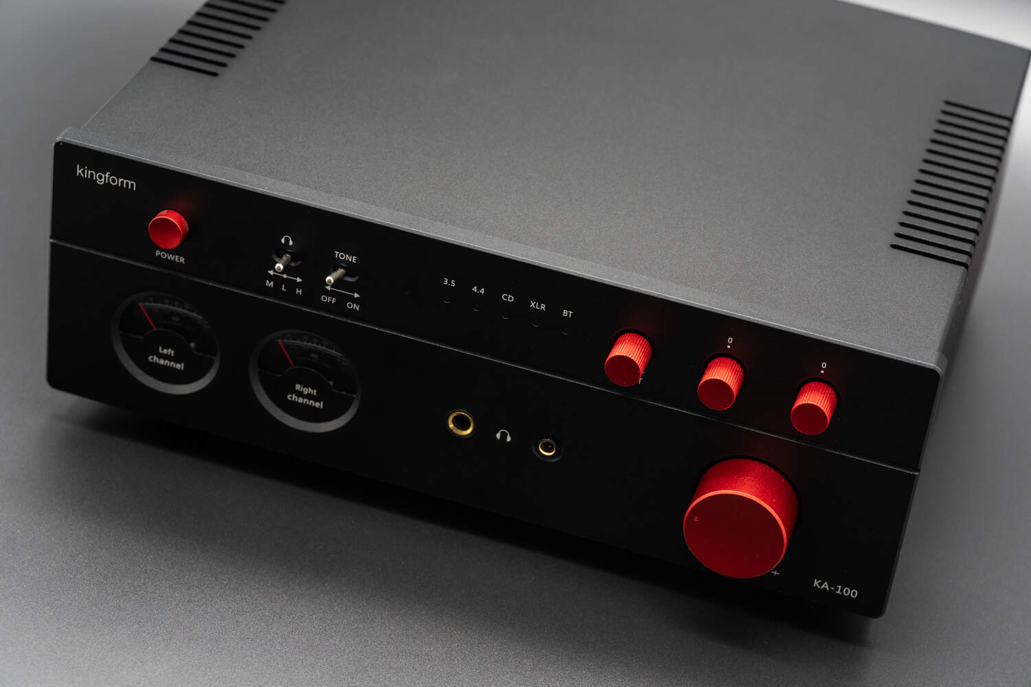外观设计方面KA-100走的是复古路线,体型比同价位同类型产品要大上不少,三维尺寸297x270x110mm,比我桌面上的飞傲K17大了一圈都不止,重量也达到了接近8公斤。机身顶盖是封闭设计,包括电子管、电源变压器、输出变压器在内的诸多元器件都密布在内;机盖两侧的窗口让我想到了LAMY钢笔盒的设计,透过窗口可以隐约看到里面的电子管和其他元件。机身正面的面板做了上下分层设计,宽大的空间合理分布着各区域的功能按钮。最为醒目的自然是左下的两个VU表,能分别显示左右声道的输出电平;最右侧则是宽大的音量旋钮,由于这机器驱动力很强,拧动时注意幅度以免音量过大被“炸”。KA-100几乎所有操作都通过面板上的物理按键/拨杆进行,如耳机阻抗匹配拨杆(玩惯了随身的人可能会当成高中低增益)、直通开关、独立的低频和高频调节旋钮、输入选择等,逻辑清晰,简单直观。作为定价四千档的台式耳放,KA-100只配备了4.4mm和6.35mm两个耳机输出口,兼顾了单端和平衡,如果你的耳机是XLR平衡插头的,需要通过转接或更换插头来适配——从这一点来讲,KA-100给我留下的印象其实是“复古的外壳,现代的灵魂”,关于这点后面会细说。KA-100机身背面依次是3.5、4.4、CD、XLR、蓝牙音源输入接口(天线),以及电源接口。除了支持蓝牙输入有点新奇外,它就是一台简单纯粹的纯耳放。