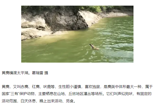 近些年来,黄山区太平湖的生态环境持续向好,各类野生动物频频现身,当地村民多次拍摄到野猪、猴子、黄麂横渡太平湖。
