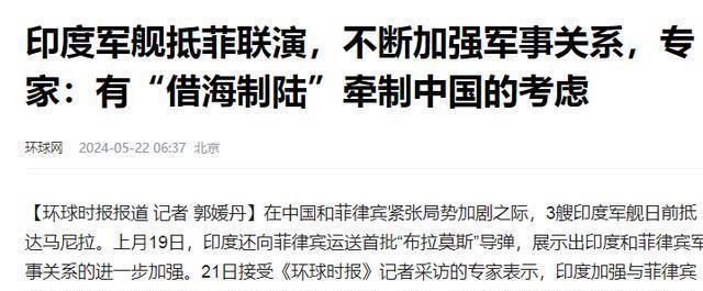 环球网 2024 年 5 月 22 日 6 点 37 分消息:《印度军舰到菲律宾联合军演,持续强化军事关系,专家称:存在“借海制陆”以牵制中国的考量》