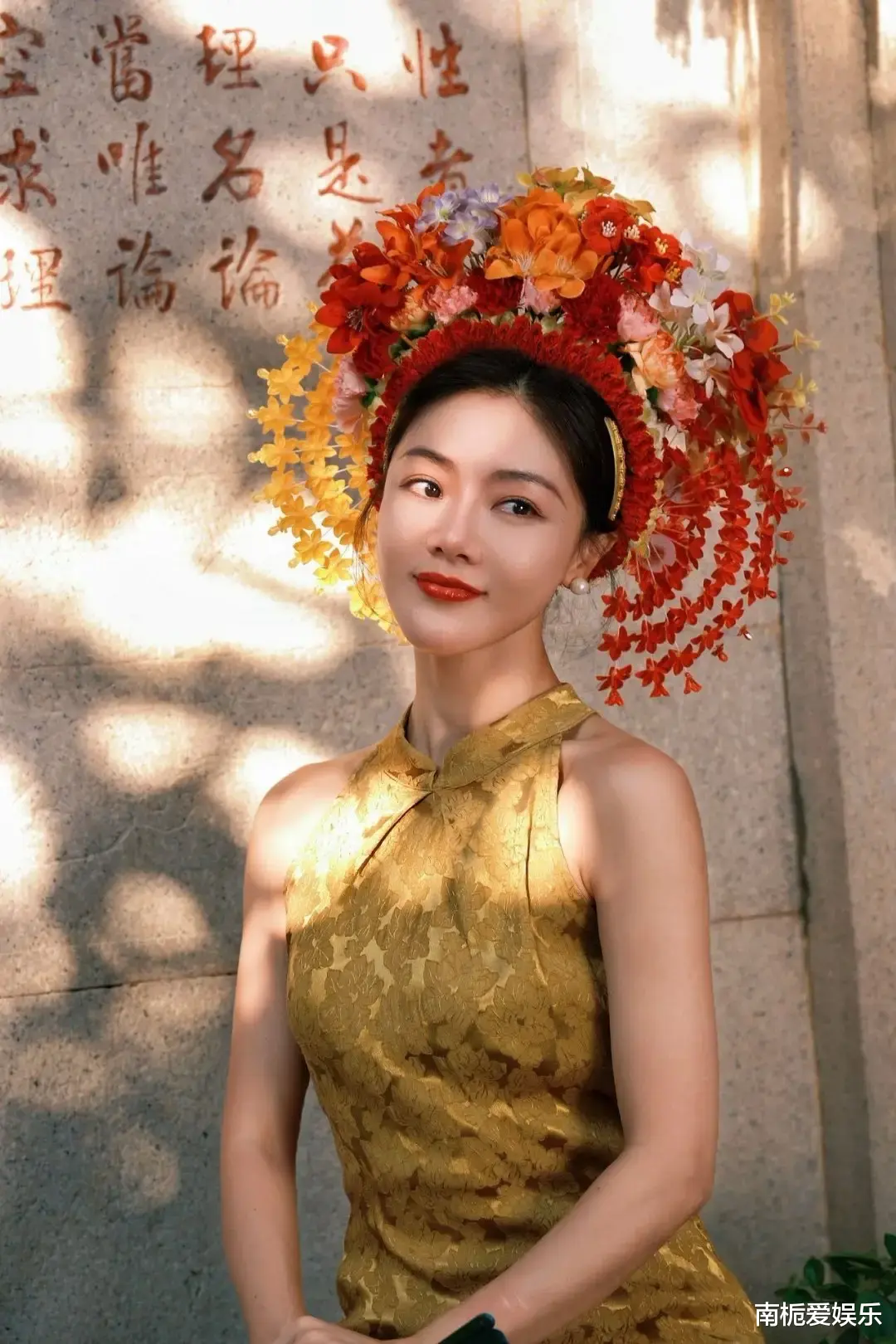 邓家佳发间层层叠叠点缀着素馨、茉莉等暖色调花卉,花团锦簇却不显繁冗,以象牙笄精心固定。那件金色旗袍摒弃了常见的亮面反光设计,选用低调奢华的哑光面料,在光影流转间泛着柔和光泽,既凸显修长身段,又避免了金饰易有的俗艳感。流畅剪裁勾勒出她常年坚持运动所保持的优越体态,举手投足间尽显优雅与力量。