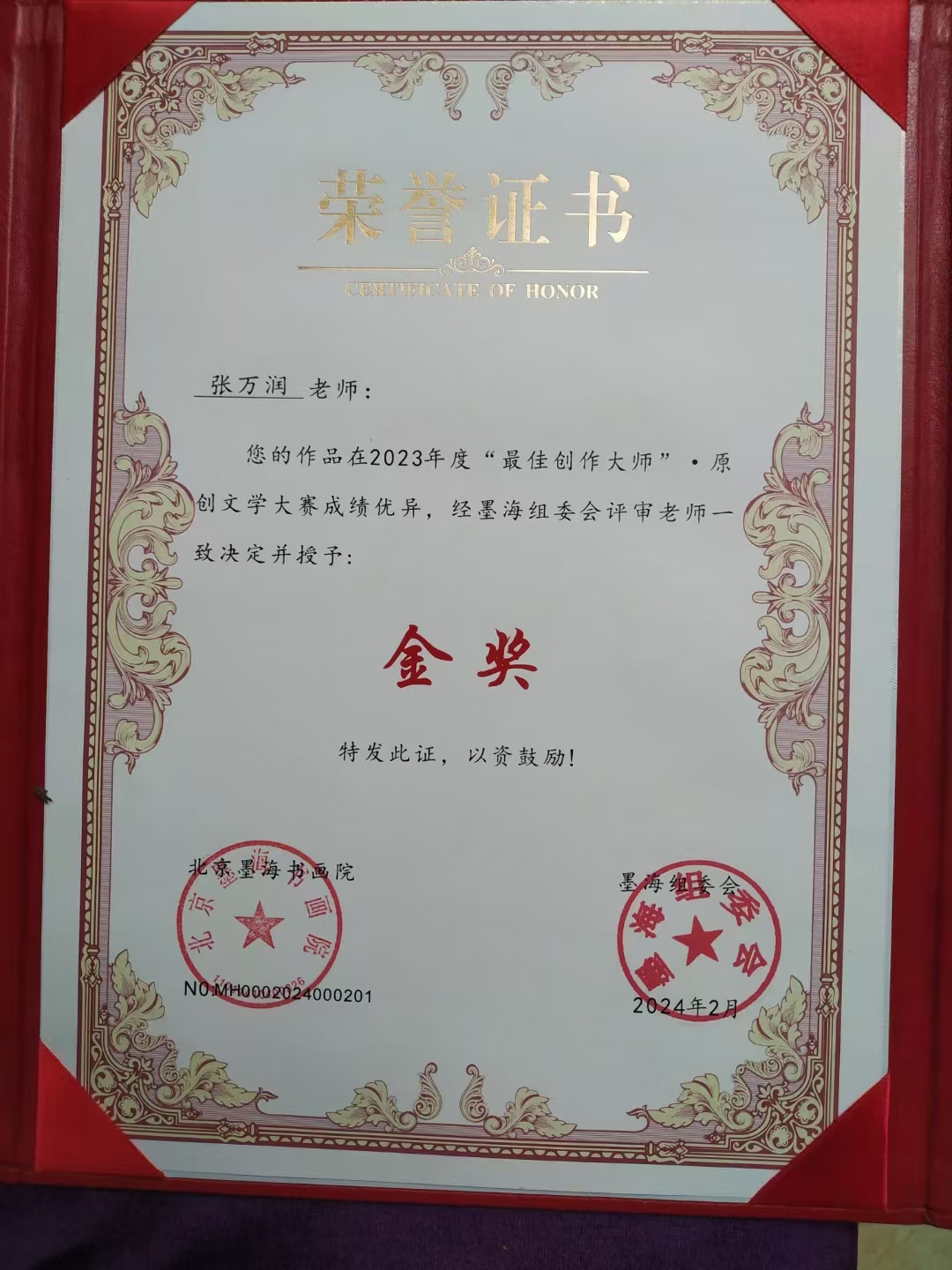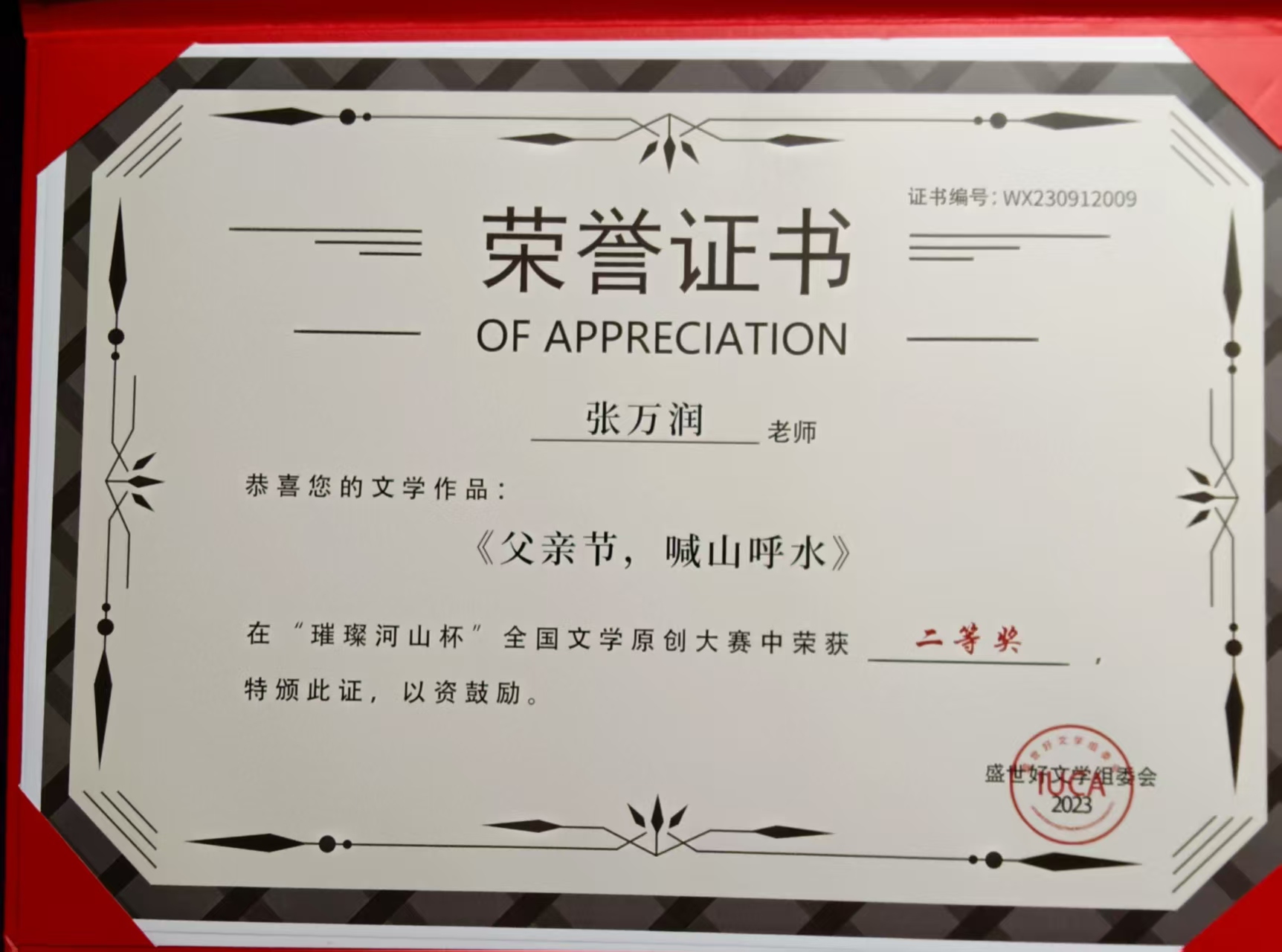 创作成果丰硕,屡获全国大奖。2023年,作品《父亲节·喊山呼水》获“璀璨河山杯”全国文学原创大赛二等奖;《代家湾·红色记忆》获“文渊杯”全国大赛三等奖;《革命烈士张光云和他胞弟张光忠一家人的红色传奇故事》斩获“墨海杯”全国原创文学大赛金奖,获评“2023年传承文学创作人物”“最佳创作大师”,并入选《世纪文韵大典》。2024年,《红色西教乡》获《现代作家》一等奖。