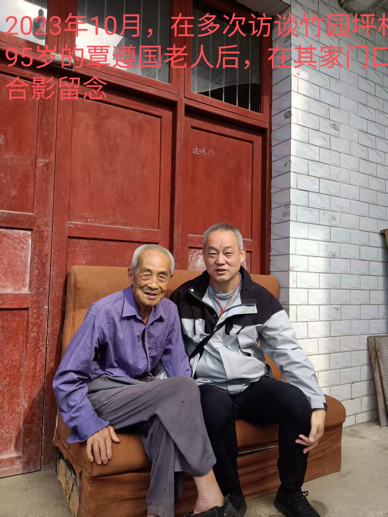 图4.张万润(右1)2021年一2023年期间,为寻找红色历史记忆,多次访谈教字垭镇竹园坪村95岁老人覃遵国后,在其家门口合影留念