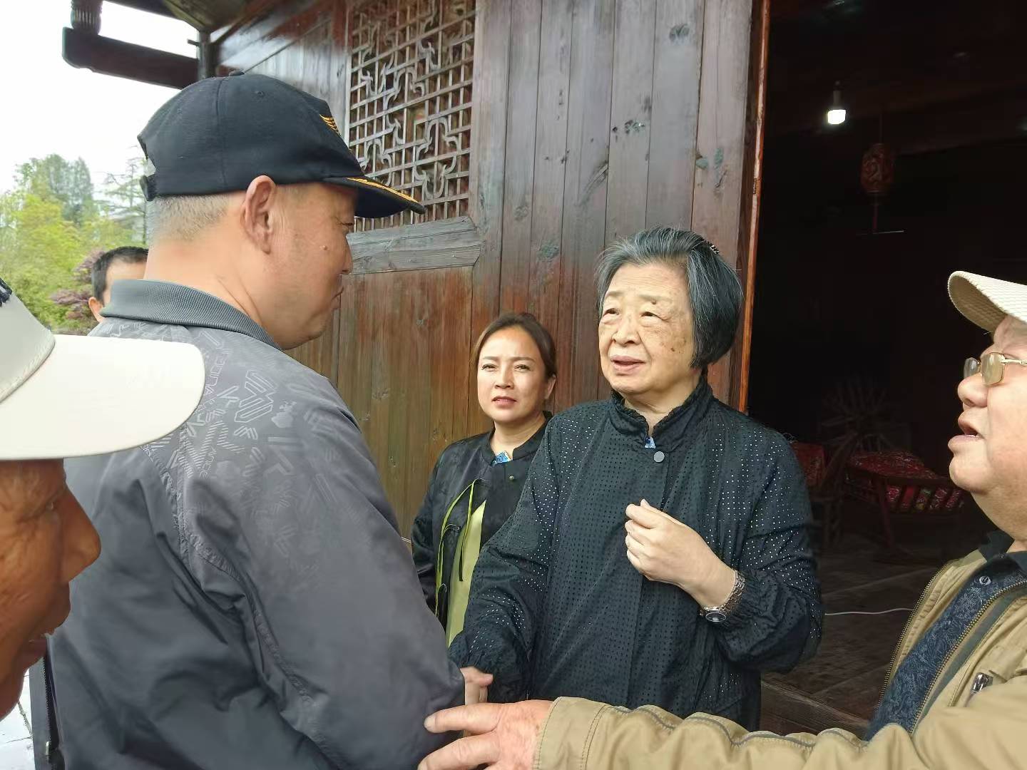 图2.在桑植县刘家坪纪念馆,张万润(左1)与贺龙女儿贺哓明(右2)握手,并亲切交谈。
