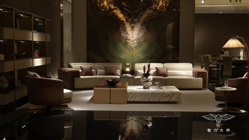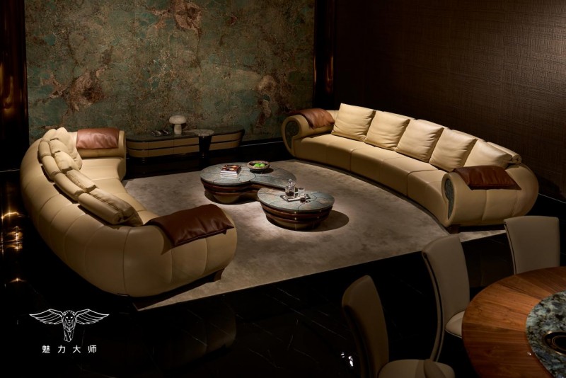而服务的精髓,则在定制化过程中得以充分展现。在魅力大师,定制远不止于尺寸的缩放,它是一场关于材质、色彩、触感与功能的全面共创。品牌提供从牛皮、天然石材、珍稀木材到五金配件的完整定制体系:业主可以亲手触摸不同等级牛皮的细腻纹理,挑选蕴含亿万年时光印记的天然奢石,甚至根据空间气质指定拉丝香槟金金属的细微光泽。这种深度参与的定制服务,让每一件家具都打上了独特的个人印记,真正实现了“我的家,由我定义”。