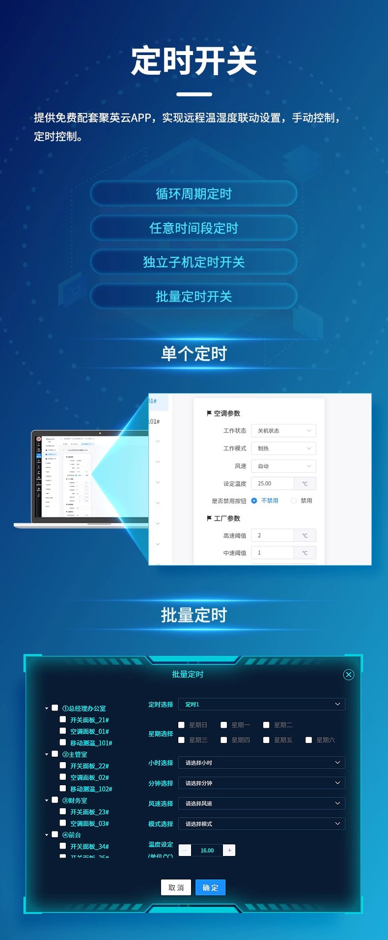 多场景定时控制:支持按日、按周设置定时任务,如家庭场景设置 工作日 7:00 开机(制冷 26℃)、22:30 关机、周末 9:00 开机(制冷 27℃)、23:00 关机;商业场景设置 商铺 9:00 开机(制冷 26℃)、22:00 关机,定时任务可一键启用 / 禁用,灵活适配不同场景需求。