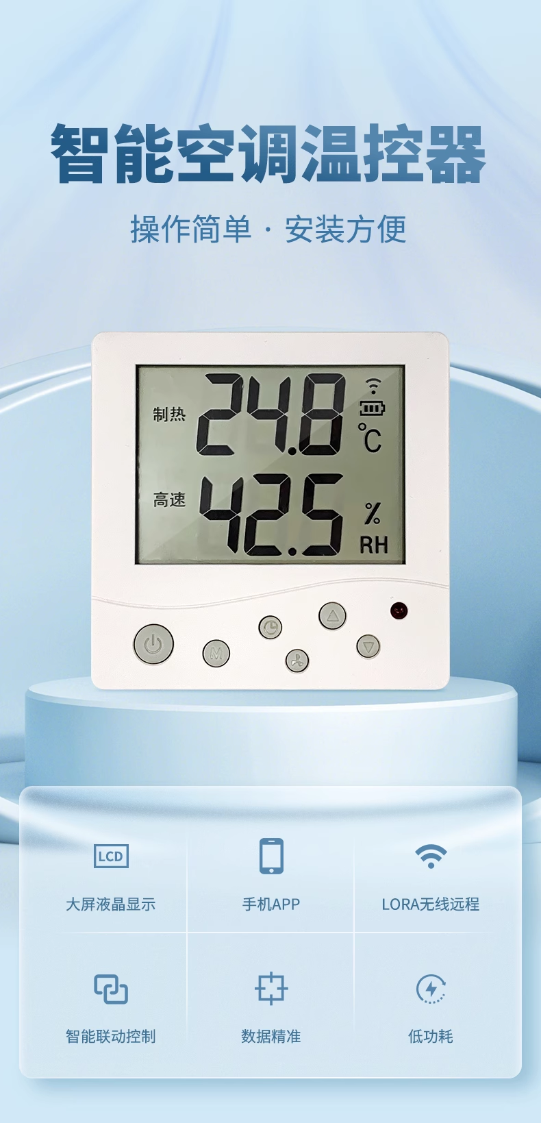 多模式智能控制:适配分体空调单台独立运行特性,LORA 智能温控器支持远程控制、定时控制、感应控制、联动控制等多种模式。用户可通过手机 APP 远程开关空调、调节温度与风速;支持设置定时任务,根据室内环境自动调节运行参数。