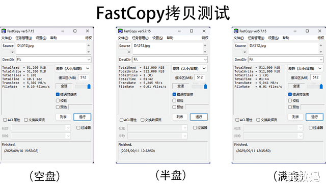 接下来我又使用50GB的数据,在FastCopy中进行模拟测试。测试依旧是在空盘、半盘、满盘三种状态下进行,从数据中能够看到,它的表现依旧稳定,三种不同状态下,速度基本没有太大区别。