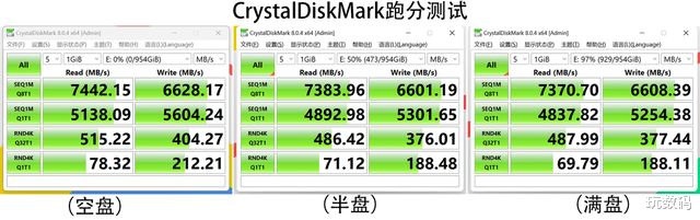 接下来,首先用CrystalDiskMark对其进行读写速度测试。可以看到,在空盘状态下,它的读取速度为7442.15MB/s,写入速度为6628.17MB/s,与官网所宣传的速度基本保持一致。为了验证长时间使用,容量被逐渐占满后速度有没有变化,我又分别测试了半盘、满盘状态下的速度,通过数据能够看到它的读取速度依旧能够保持在接近7400MB/s的状态,写入速度依旧在6600MB/s,与空盘状态下并没有太大变化。