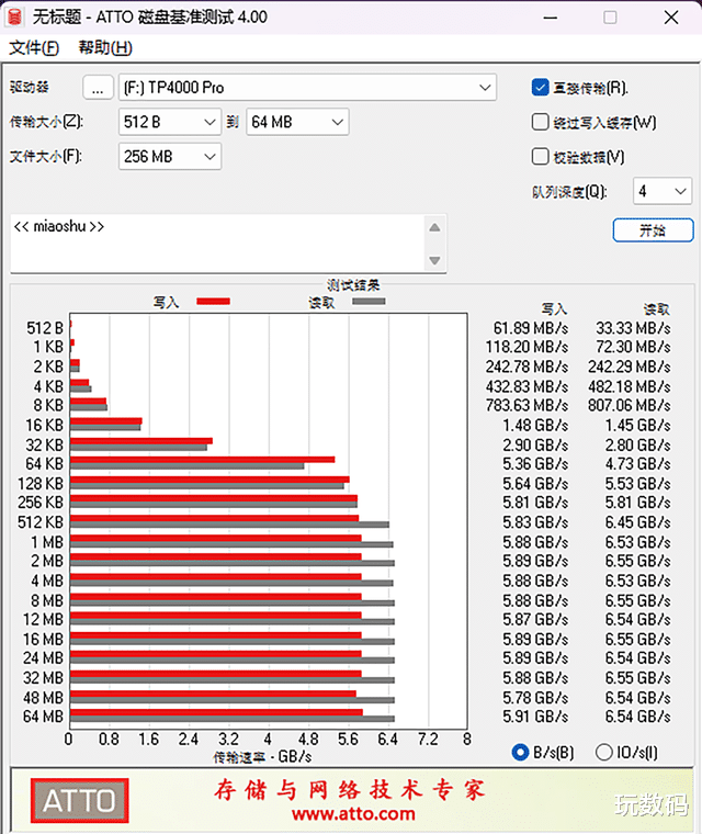 使用ATTO磁盘基准测试,最终得到的测试结果是顺序读取6.54GB/s,顺序写入5.91GB/s。