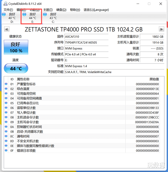进行了各种测试之后,我又打开CrystalDiskInfo,它此时的温度也才44℃,不得不说,腾隐TP4000 PRO的散热性能确实很强。