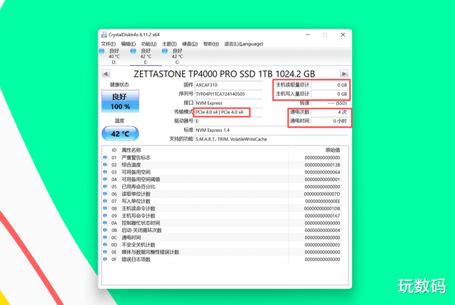 通过CrystalDiskInfo软件来查看一下腾隐TP4000 PRO的基本信息,能够看到,它现在在我电脑上的传输模式是PCIe4.0x4,也就是满血在跑了。然后读取、写入总量均为0GB,通电次数4次,通电时间0小时,说明了它就是一块全新的固态硬盘,可以放心使用了。