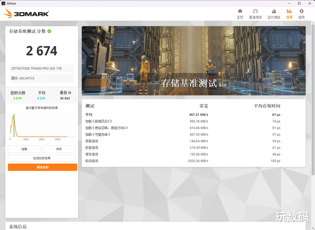 在3DMark中使用存储基准测试,腾隐TP4000 PRO的得分是2674。这个成绩对于日常实用来说已经是非常不错了,不管是办公还是打游戏,都完全没有问题。