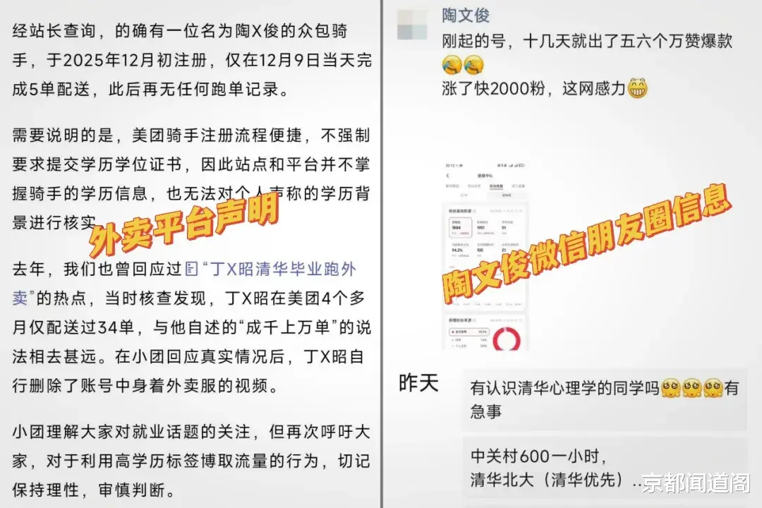 然而,真相很快浮出水面。美团平台回应称,确有一名陶姓众包骑手于2025年12月初注册,但仅在12月9日完成5单配送,此后再无跑单记录。平台同时表示,骑手注册无需提交学历证明,并不掌握其学历信息,更无法核实其“北大毕业”的身份真伪。随后,相关视频被悄然删除。所谓“北大毕业送外卖”,即便当事人真为北大学子,也不过是一场精心策划的“打卡式”表演——利用“名校生”与“外卖员”的身份反差,搭建起一个标准的流量起号剧本。若其学历本就子虚乌有,则更是彻头彻尾的欺骗。