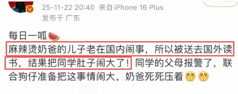 一条消息直接指“麻辣烫奶爸”的儿子,在国外读书把同学肚子闹大,同学父母报警,还联合狗仔想把事情闹大。而男方家长在用力压此事,想要保住儿子的前程。