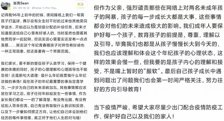 天天读初中的时候因为谈恋爱上过热搜,张亮当时还发了长文回应。现在又闹出这样的事,张亮还没有出来澄清。