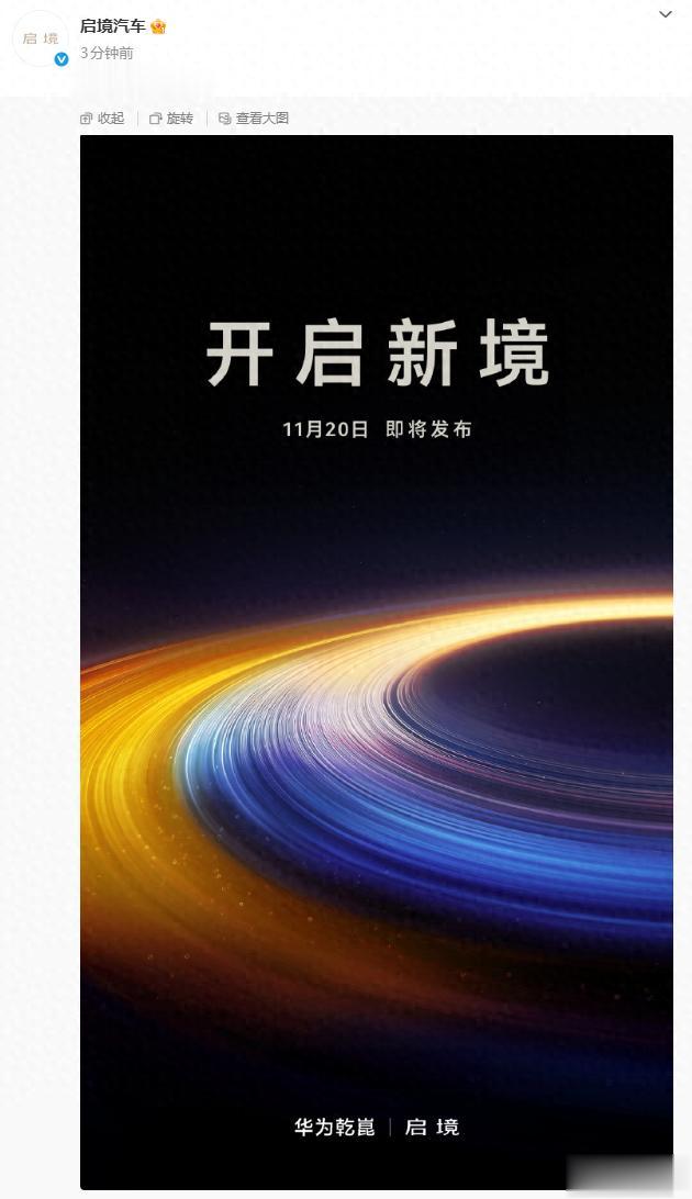华为乾崑生态大会将于11月20日晚在广州隆重举行,届时启境品牌将正式发布。在官方预告海报中,“华为乾崑|启境”联合LOGO首次亮相,这一标识形式在华为汽车业务中独一无二,既体现了启境在乾崑生态中的特殊定位,也彰显了双方在品牌与产品层面的深度共创与高度互信。