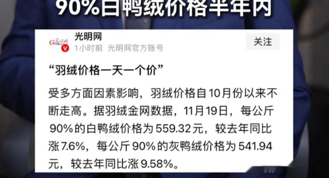 最近北方天气骤降,羽绒服成了救命刚需。可最近市场炸锅了:鸭绒价格飙涨41万,鹅绒更突破"天价"!正规厂一件短款羽绒服出厂价都快摸到千元门槛。