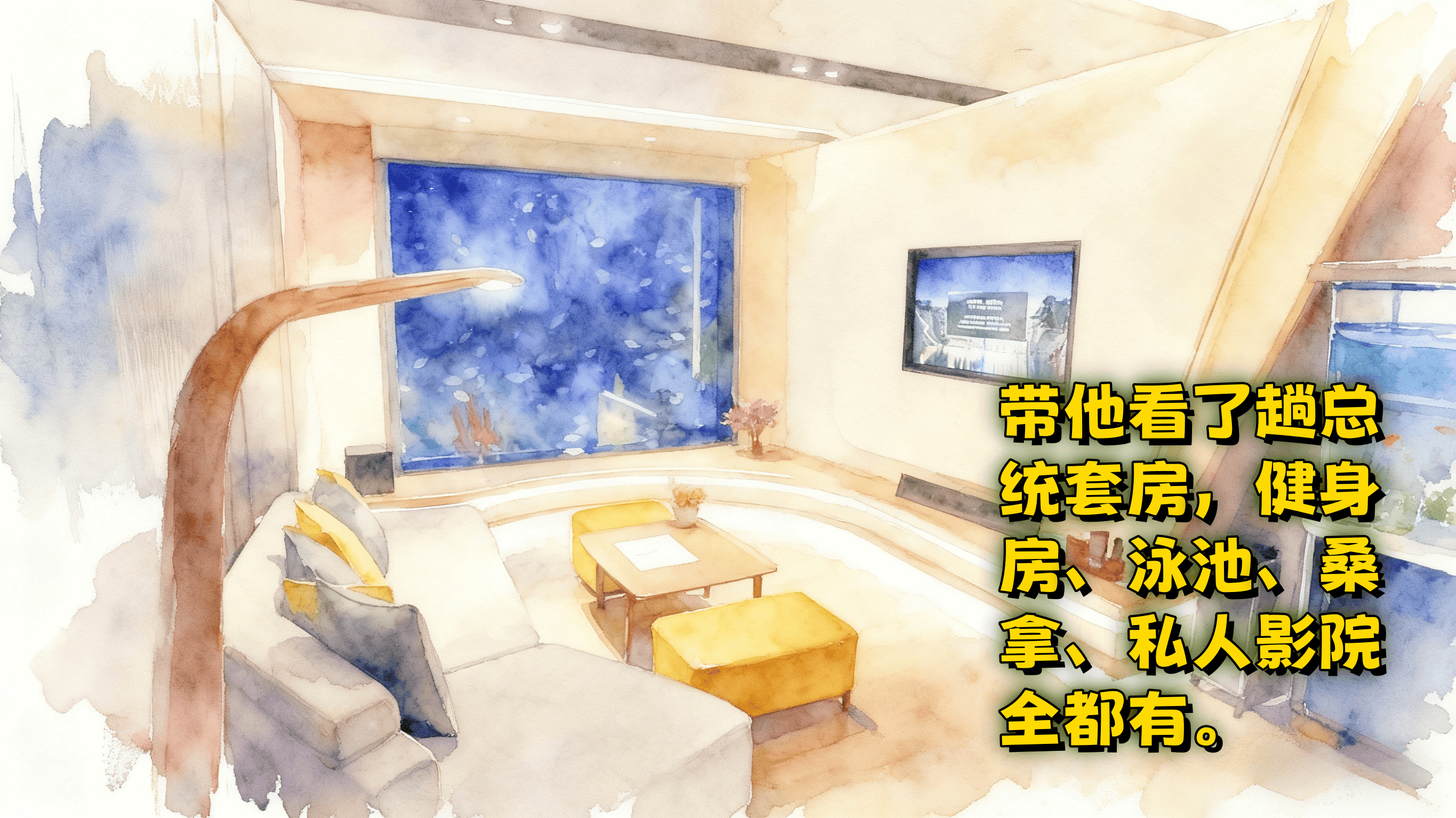 带他看了趟总统套房,健身房、泳池、桑拿、私人影院全都有。