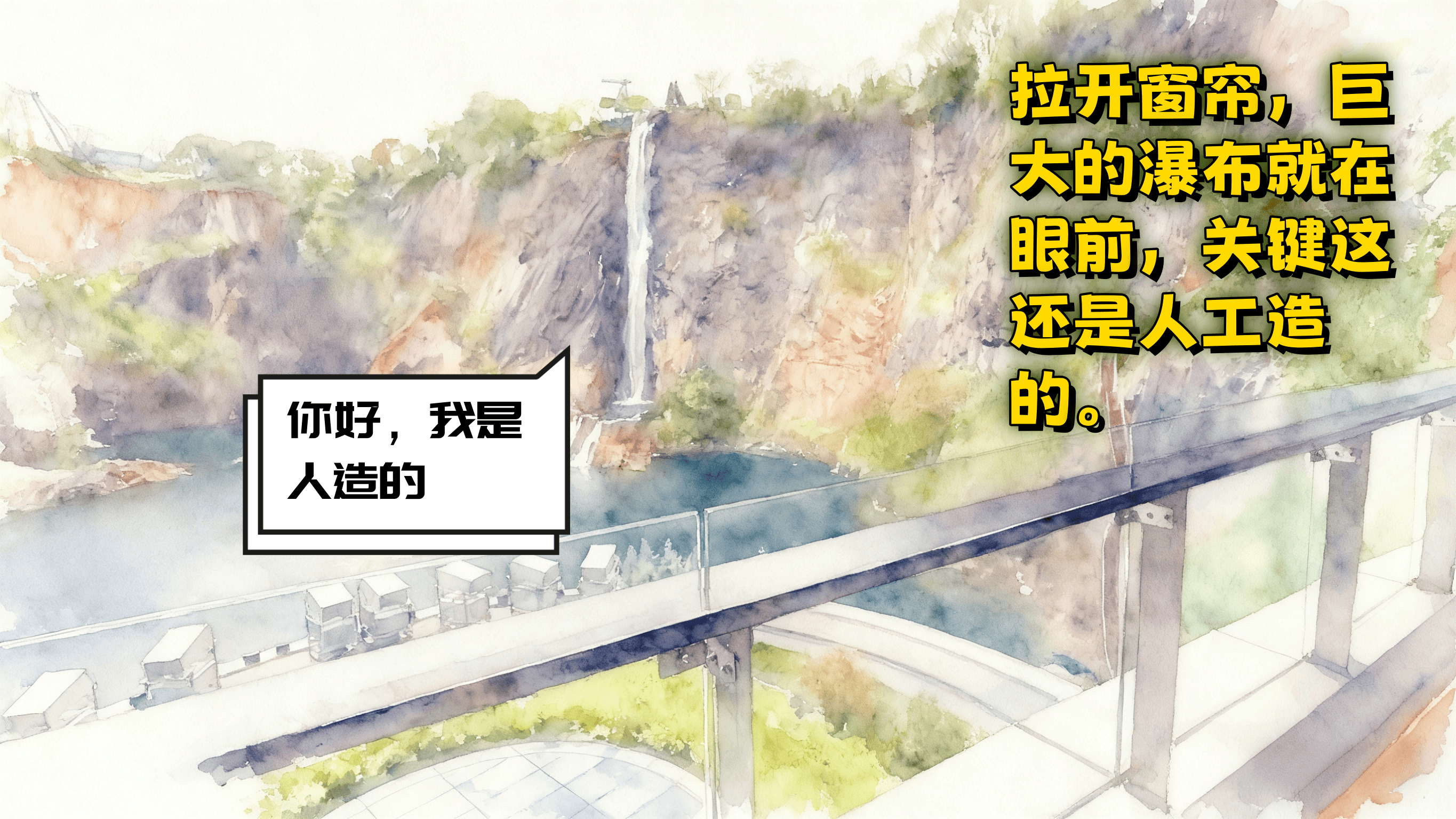 拉开窗帘,巨大的瀑布就在眼前,关键这还是人工造的。