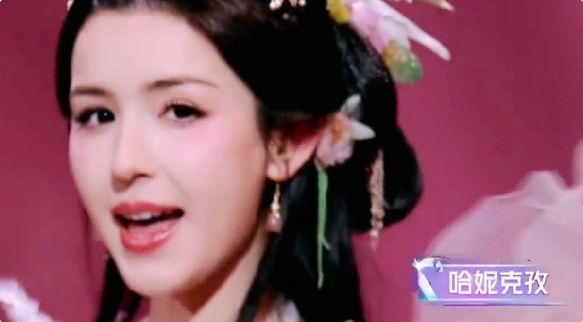 尽管哈妮克孜的长相明艳妩媚,但是舞台上的她更显柔美明媚。舞台上,她一身粉蓝色调的长裙,温婉长发像蝴蝶仙子,镜头一闪而过,但精致小脸却给观众留下挥之不去的震撼。