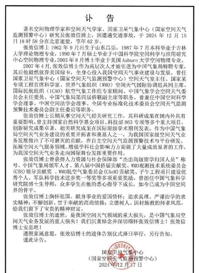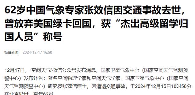 极目新闻在2024年12月17日关于《62岁中国气象专家张效信因交通事故去世曾放弃美国绿卡回国,获“杰出高级留学归国人员”称号》的报道