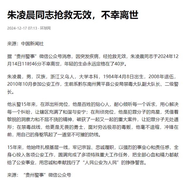 环球网在2024年12月17日关于《朱凌晨同志抢救无效,不幸离世》的报道