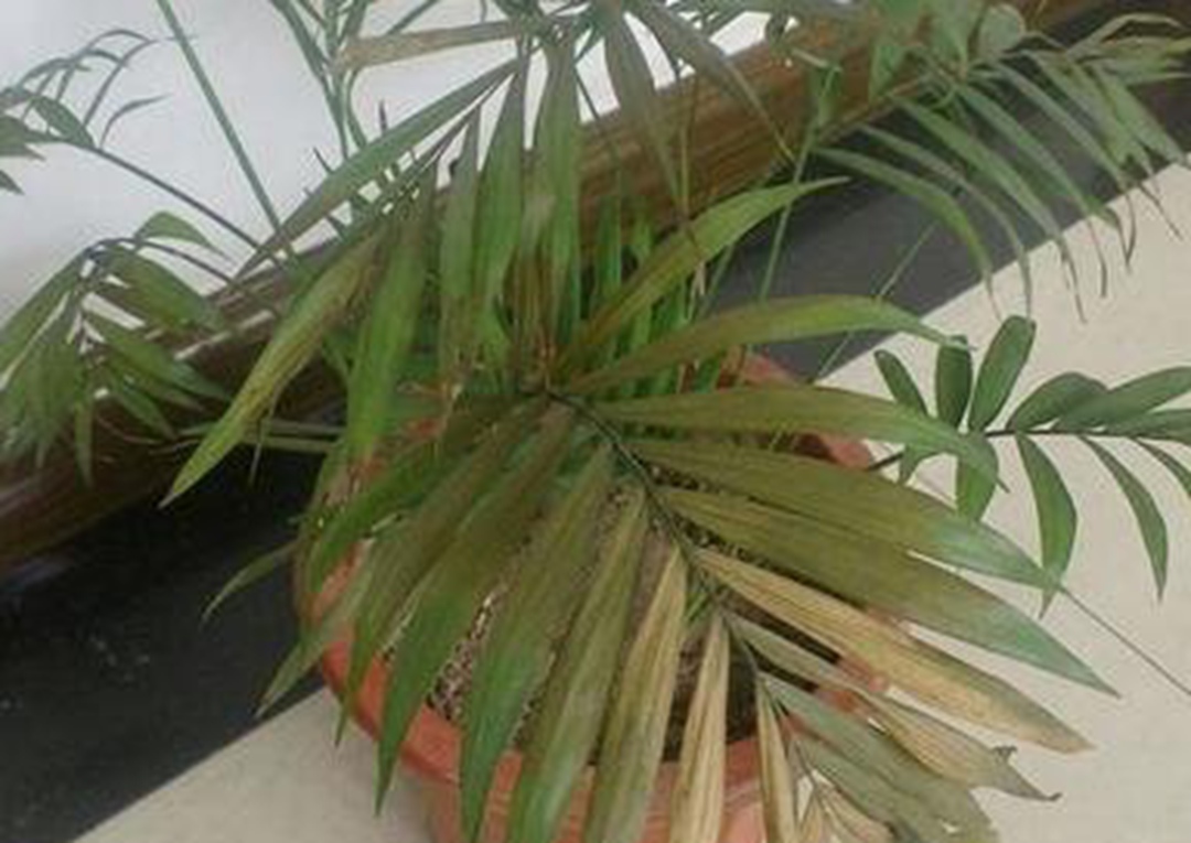 再看看办公区的环境,很多公司都喜欢在办公室放散尾葵。有个互联网公司的员工就发现,他们公司的散尾葵总是黄叶。原来是因为办公区灯光太强,而且人员走动多,带起了很多灰尘,散尾葵的叶片上灰尘太多影响了光合作用。后来他们每天用湿布轻轻擦拭叶片,散尾葵就慢慢好起来了。