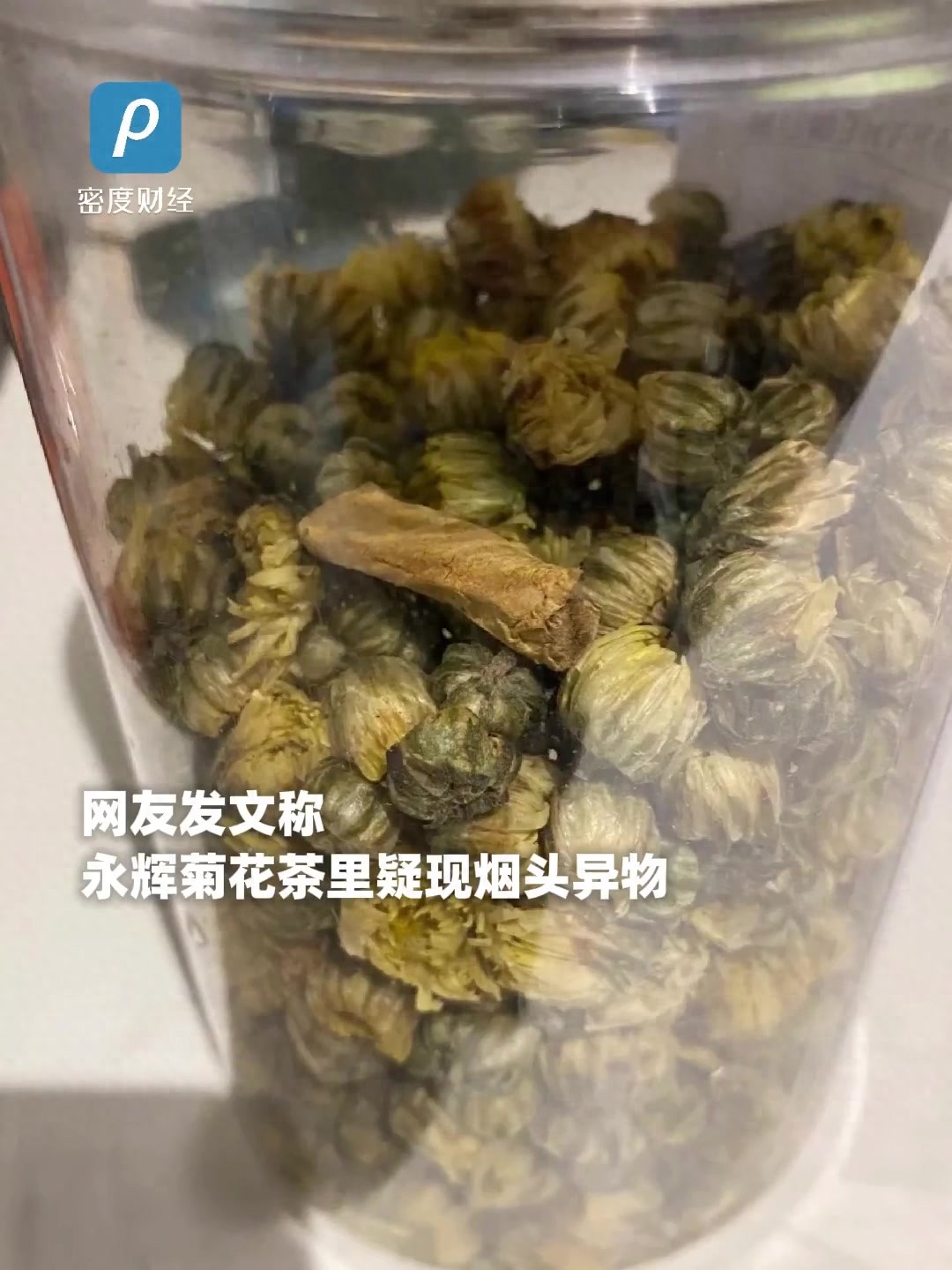 近日,有网友在社媒发帖吐槽,称自己在广州一永辉超市购买的菊花茶,泡了四分之一才发现里面竟然有一个“极其像是烟头的异物”,帖子随即引发热议。