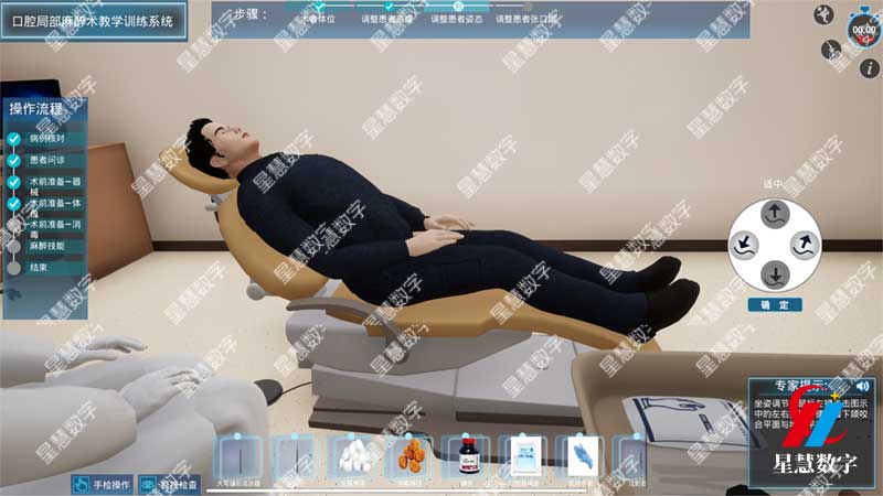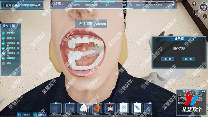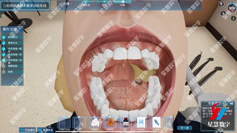 从消毒(虚拟棉球擦拭注射区域)、隔湿(模拟吸唾器保持术区干燥)到进针(控制针头角度与深度),系统将操作流程拆解为标准化步骤。每一步操作都会触发实时反馈,帮助学生精准掌握轻柔进针匀速推药的核心技巧。