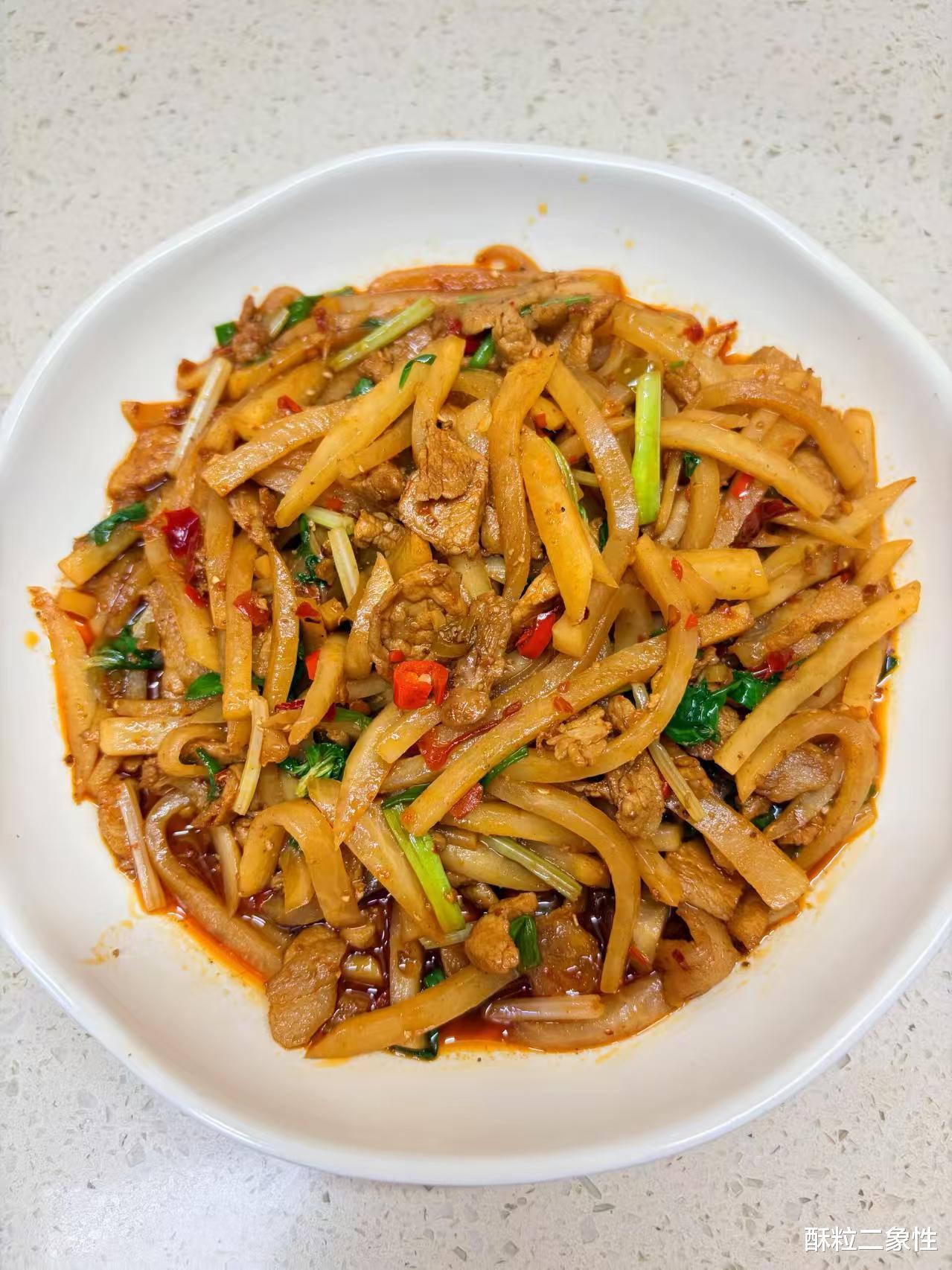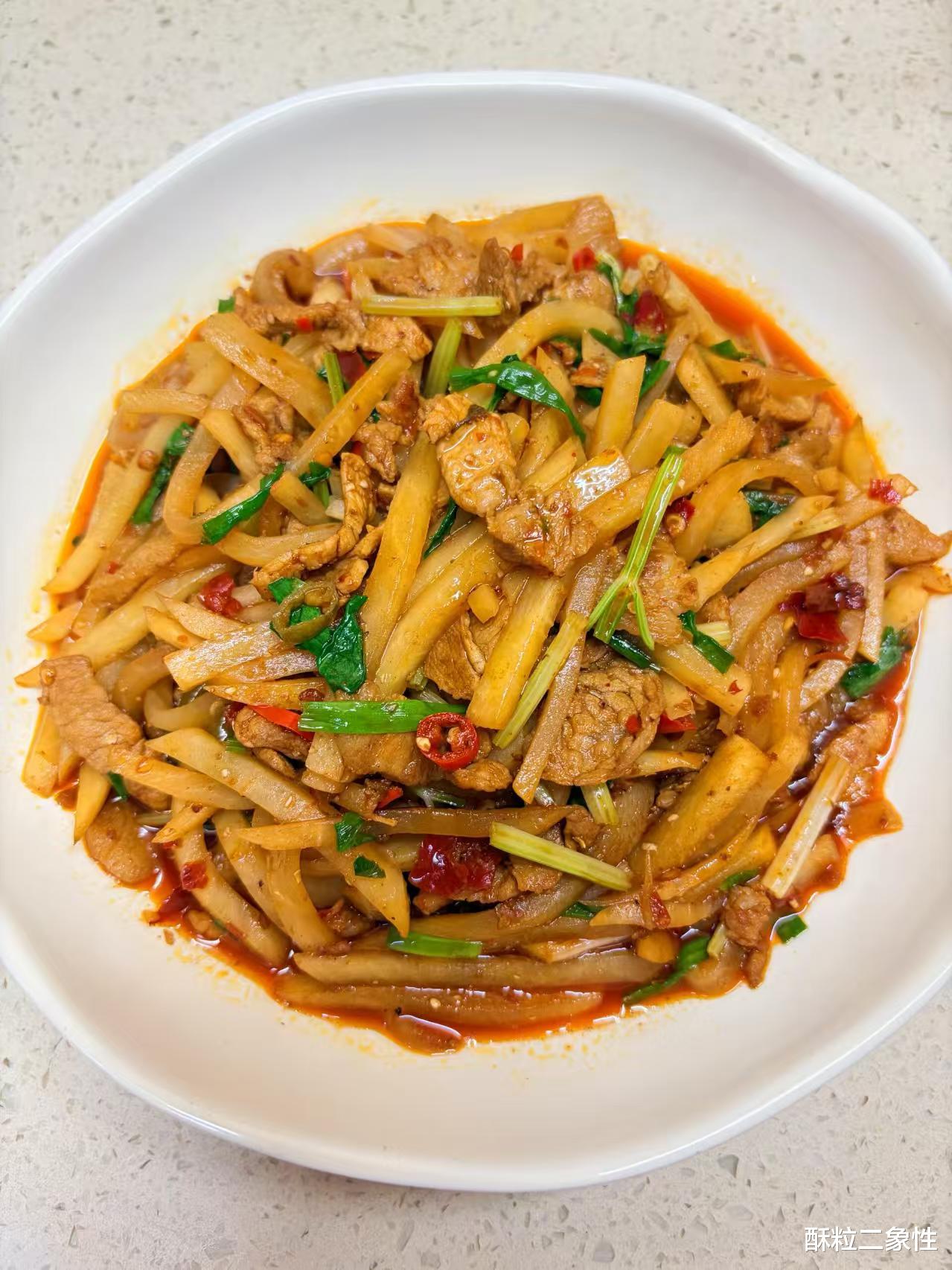 我这才明白,家常菜不是没技巧,而是技巧太简单,简单到没人当回事。比如炒这盘萝卜炒肉,萝卜得选那种表皮光滑、掂在手里沉甸甸的,切条别切太细,太细容易软,太粗又不入味;肥肉得选五花肉最上面那层,煸出来的油才香;泡椒别用瓶里那种软塌塌的,得用自家泡的,脆、酸、辣,炒出来才有灵魂。豆瓣酱别贪多,一小勺就够,多了抢味,少了又不够香。火候最关键,萝卜下锅后别急着翻,让它在锅里静静待一会儿,边缘煎出一点点焦痕,再翻炒,香得你直咽口水。