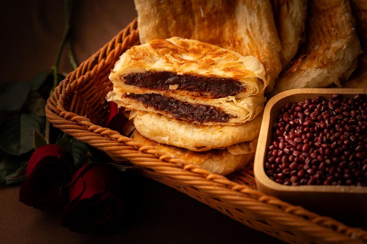 师傅们正戴着白帽子,双手在案板上麻利地揉着面团。面团被揉得光溜溜的,像个听话的小胖娃娃。只见揪起一个小面团,用手掌按扁,舀一勺豆沙馅放在中间 —— 用的是东北红小豆,提前泡够六个小时,小火慢熬到起沙,不加一点防腐剂,甜得醇厚不腻。最绝的是,在豆沙里拌上玫瑰酱,不是那种齁人的香精味,是新鲜玫瑰花瓣腌出来的,带着自然的清冽花香。