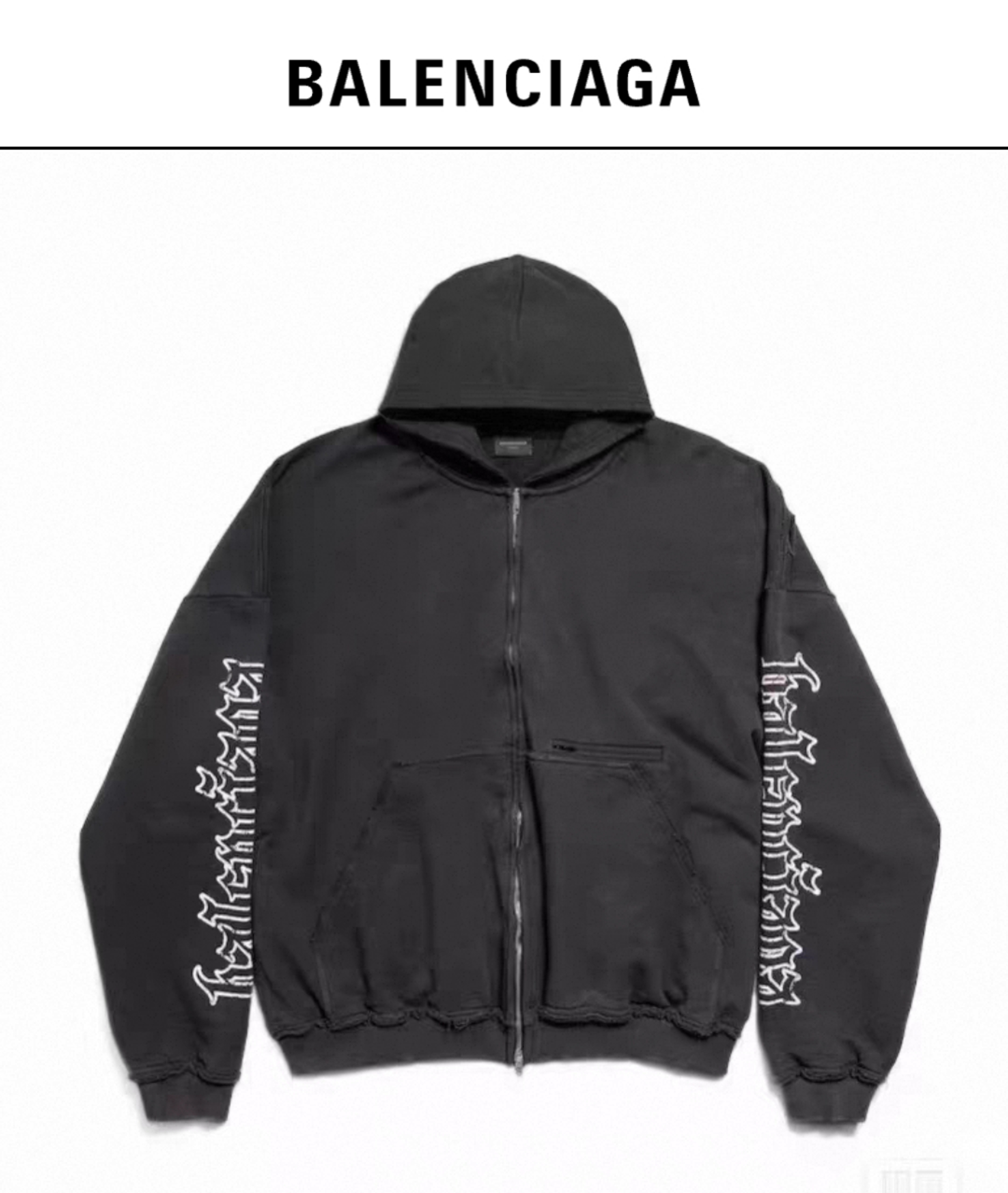 4、最精彩的,即为郭二公子的上衣与下裤了,初以为是一套装,实则天差而地别。其上衣为 Balenciaga 巴黎世家 25 BLACKLETTER SCRIPT PULLED 大号版连帽卫衣。