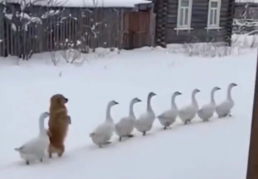 但是狗子已经很努力的融入其中,虽然有一些瑕疵,但是鬼鬼祟祟的步伐,让狗子一下子气质就不一样了,它已经成功融入倒鹅圈了,真是有志者事竟成!