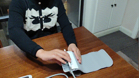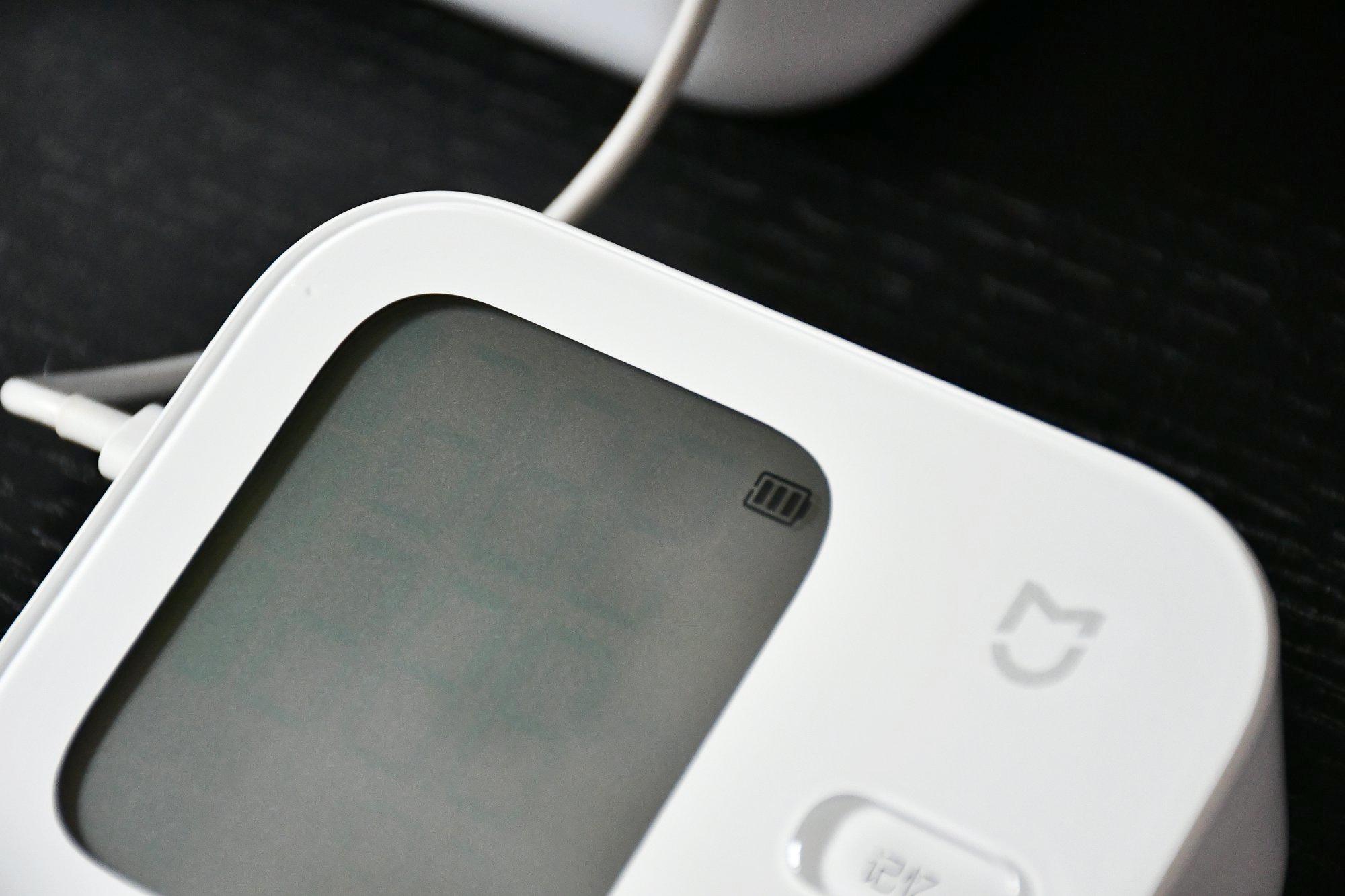 看完主机和袖带,我们来组装测试一下,需要注意的是首次使用要进行充电激活,将充电口接入电源充电即完成激活。由于出厂时本身电量较少,建议充满电后进行测量。主机内置1800mAh的锂电池,在满电的状态下可以实现3个月的长续航。