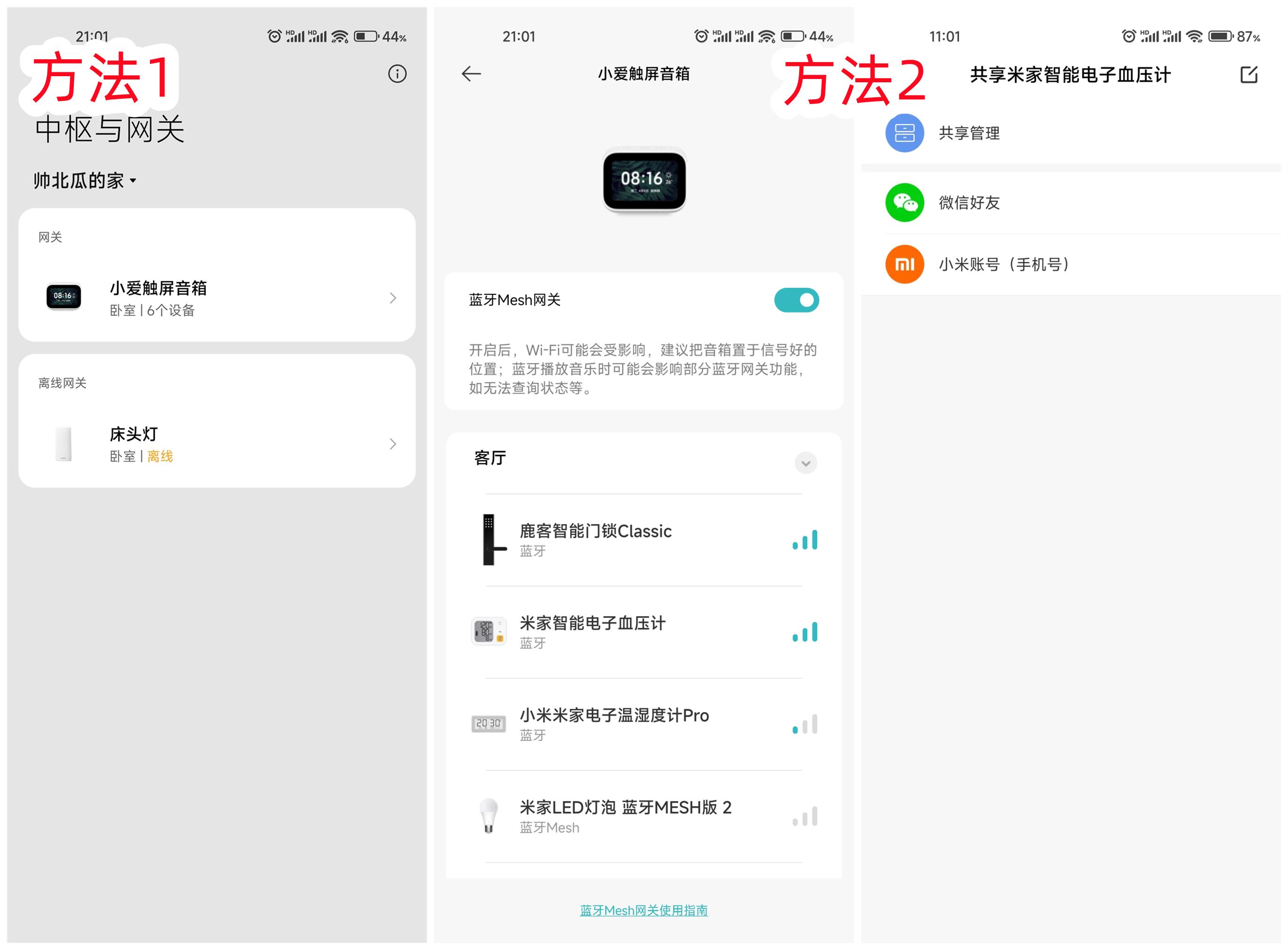 最后要说的一点就是远程查看血压数据,通过米家APP有多种方式可以远程查看父母的血压数据,进行血压数据管理。第一种方法是连接家中具备蓝牙网关或内置蓝牙网关的设备,该产品就可以借助蓝牙网关功能与手机实现同步。上图为利用家中的小爱触屏音箱作为中介,实现远程连接米家智能电子血压计获取测量数据,第二种方法是通过设备共享,微信好友分享设备或小米账号分享设备,如果对方手机上有米家APP,可以直接查看数据,如无米家APP需要先下载米家APP才能完成进一步查看,这样即使不在父母身边,也能时刻了解他们的血压状况,及时提醒父母注意血压健康。