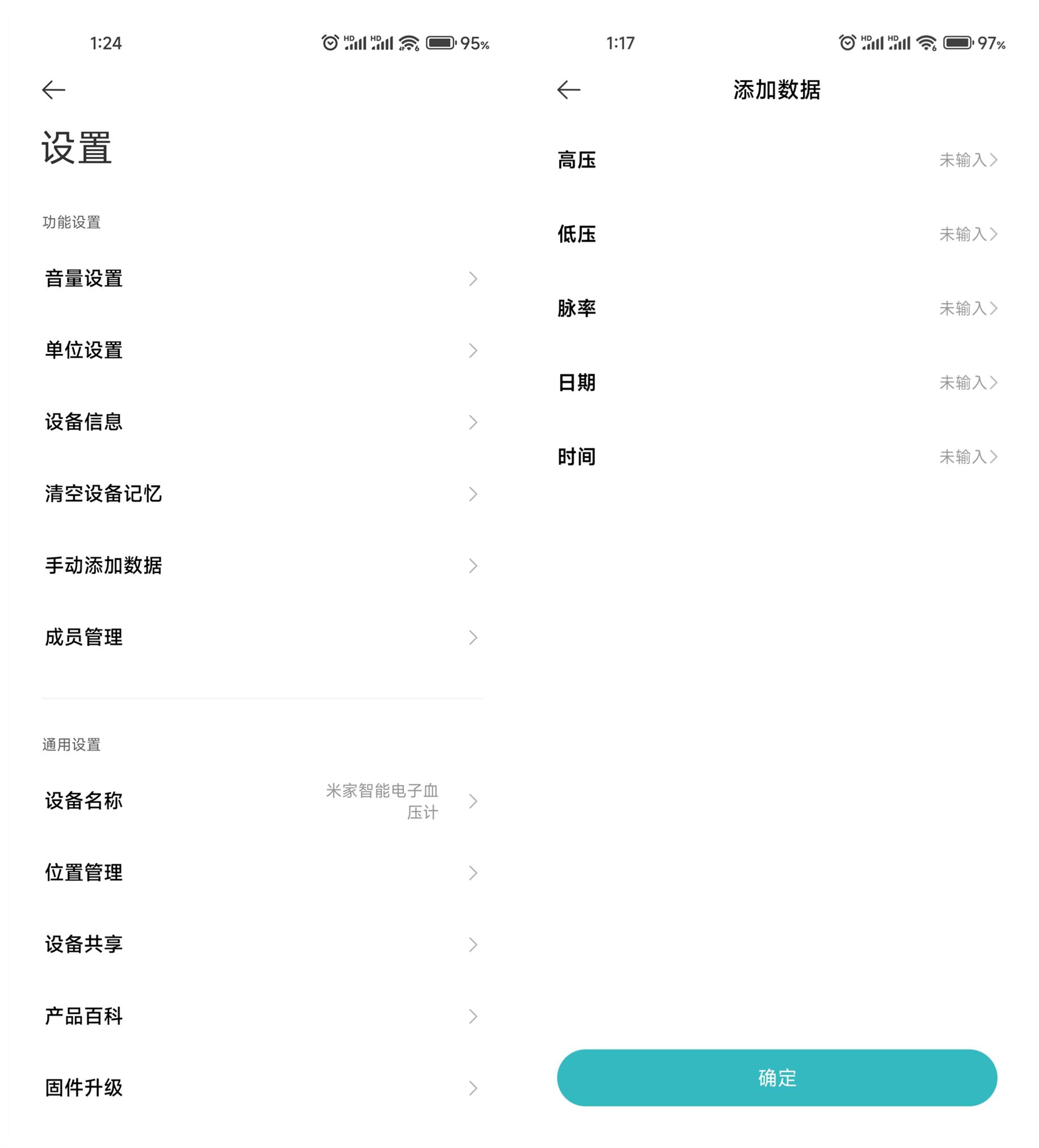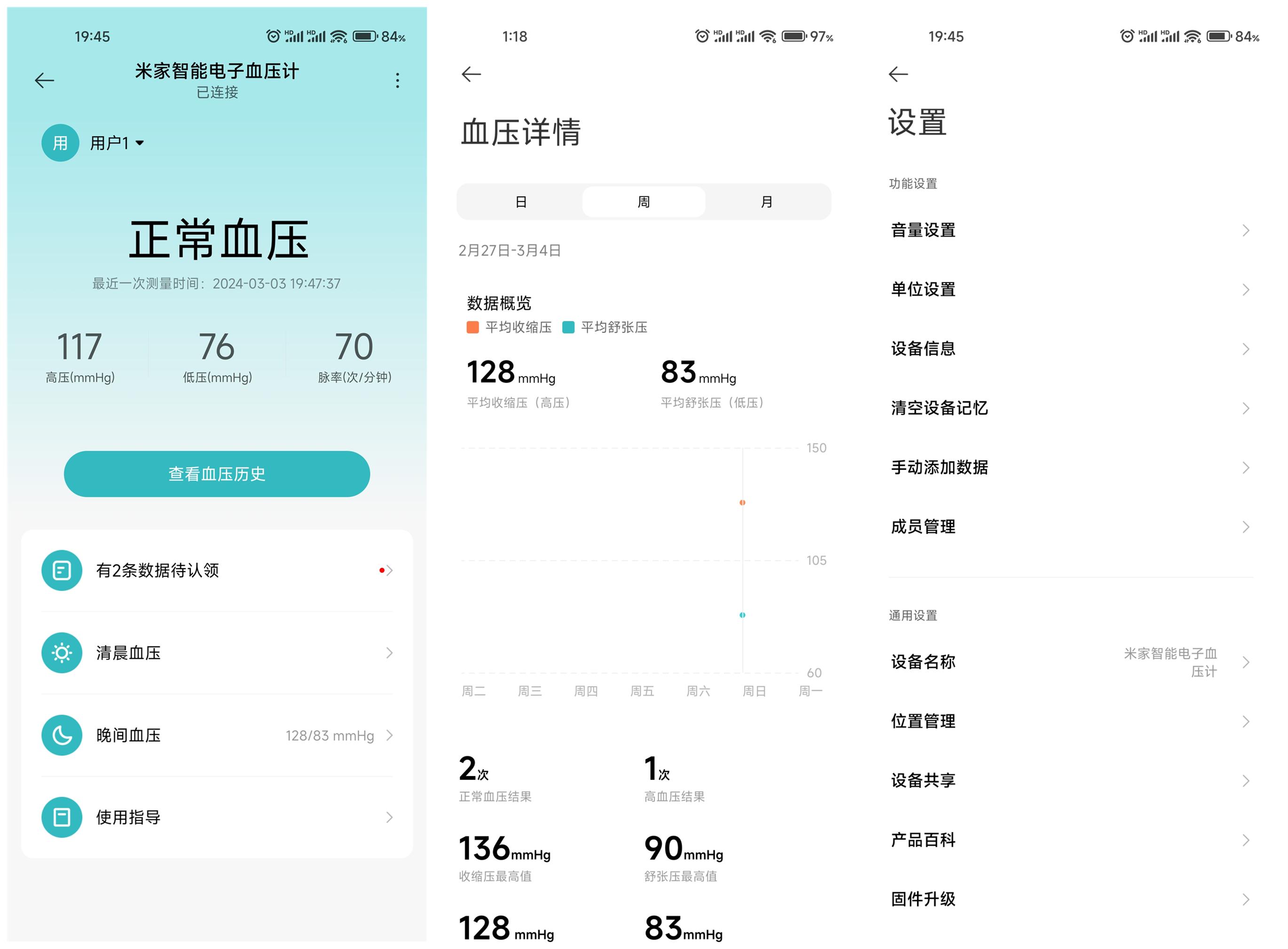 APP端主界面显示内容比较简洁,上面显示是最近一次的测量数据,紧挨着下边是历史测量数据,以日、周、月进行统计。再下面就是清晨血压、晚间血压以及使用指导。点击右上角的竖点进入设置选项,里面有几项简单的个性化设置,支持语音播报音量调节,支持对血压数据测量单位的更换,以及清空设备记忆,手动添加数据和成员管理等。个性化的设置可以使这款血压计更适配我们的日常使用习惯。