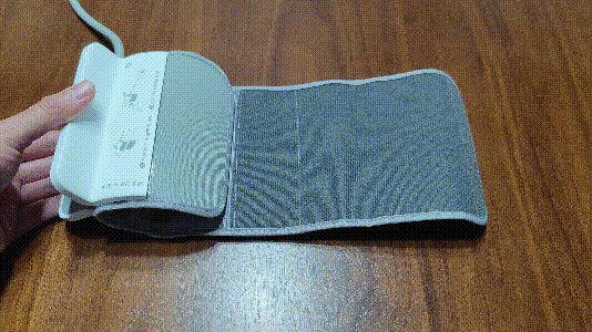 看完主机,接下来我们来看这款血压计最特别的袖带部分,不同于传统的卷绑式袖带的繁琐,这款血压计的袖带创新的采用了免绑式的夹子设计,在袖带上面配备了一个夹子,通过夹子来固定袖带,在夹子上面印有使用说明,简单两步即可完成捆绑操作。