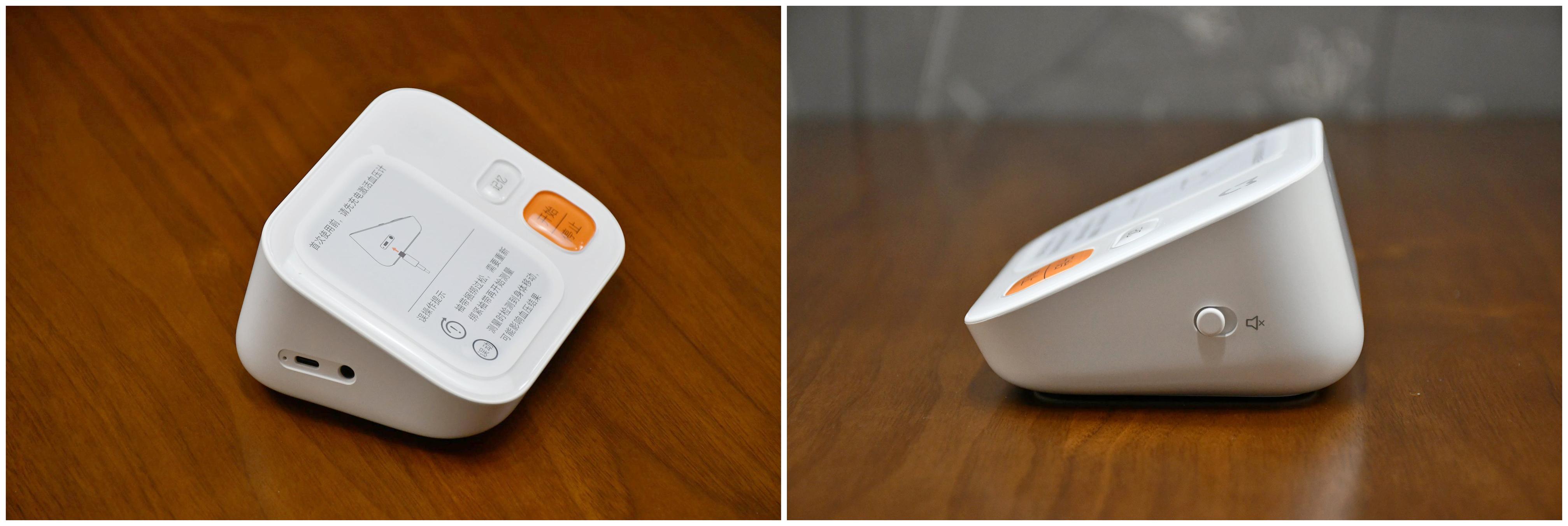 接下来就是主机,左侧比较明显的是充电口和袖带插孔,充电口另一边是一个不太明显的复位键插孔。右侧是一个语音功能开关键,通过拨动按键实现语音播报的开闭。
