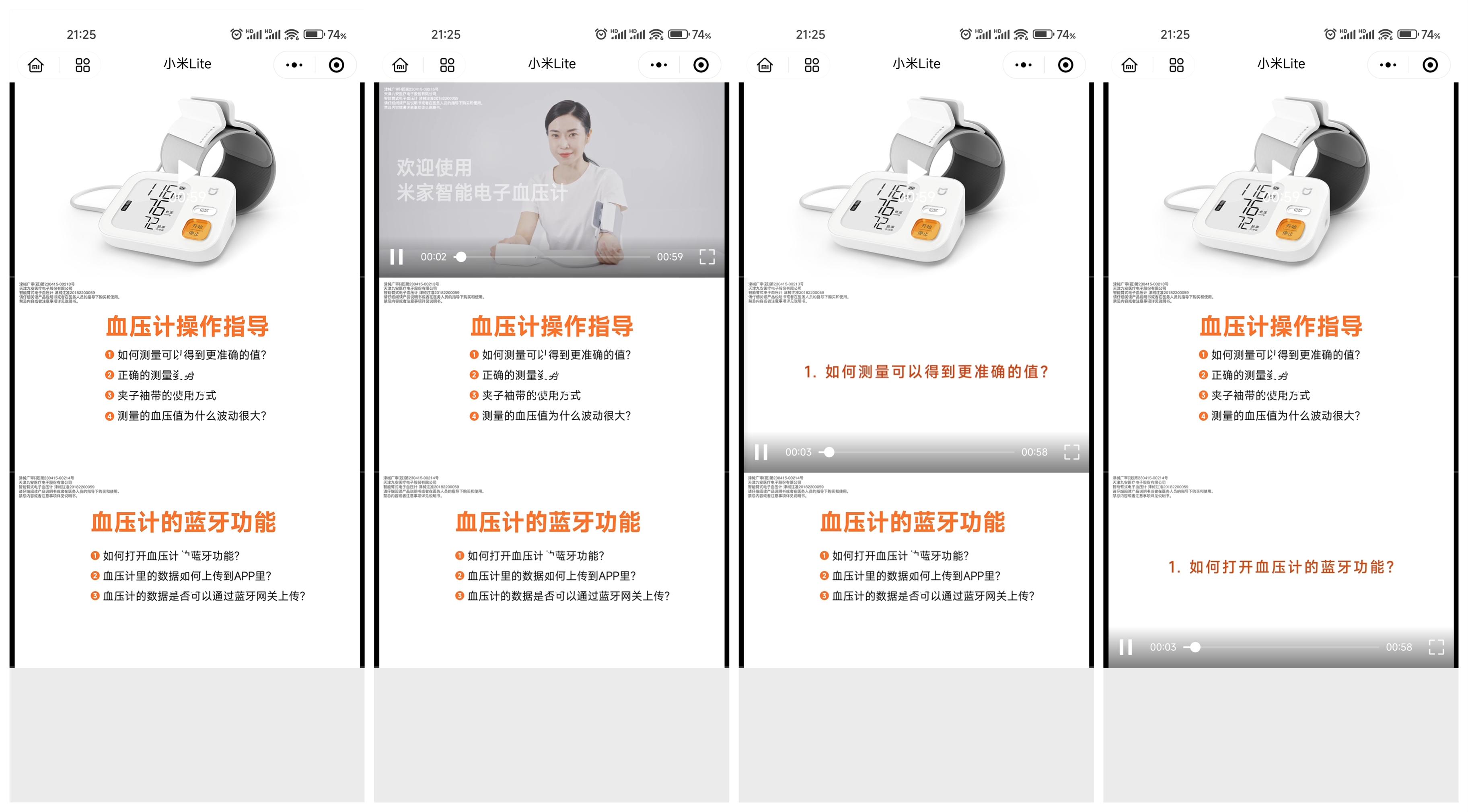 通过扫码附带的小程序卡可以观看三个使用介绍的视频,一个是快速使用,另两个是血压计操作指导和血压计的蓝牙功能,三个视频都接近1分钟,算是说明书的浓缩版。