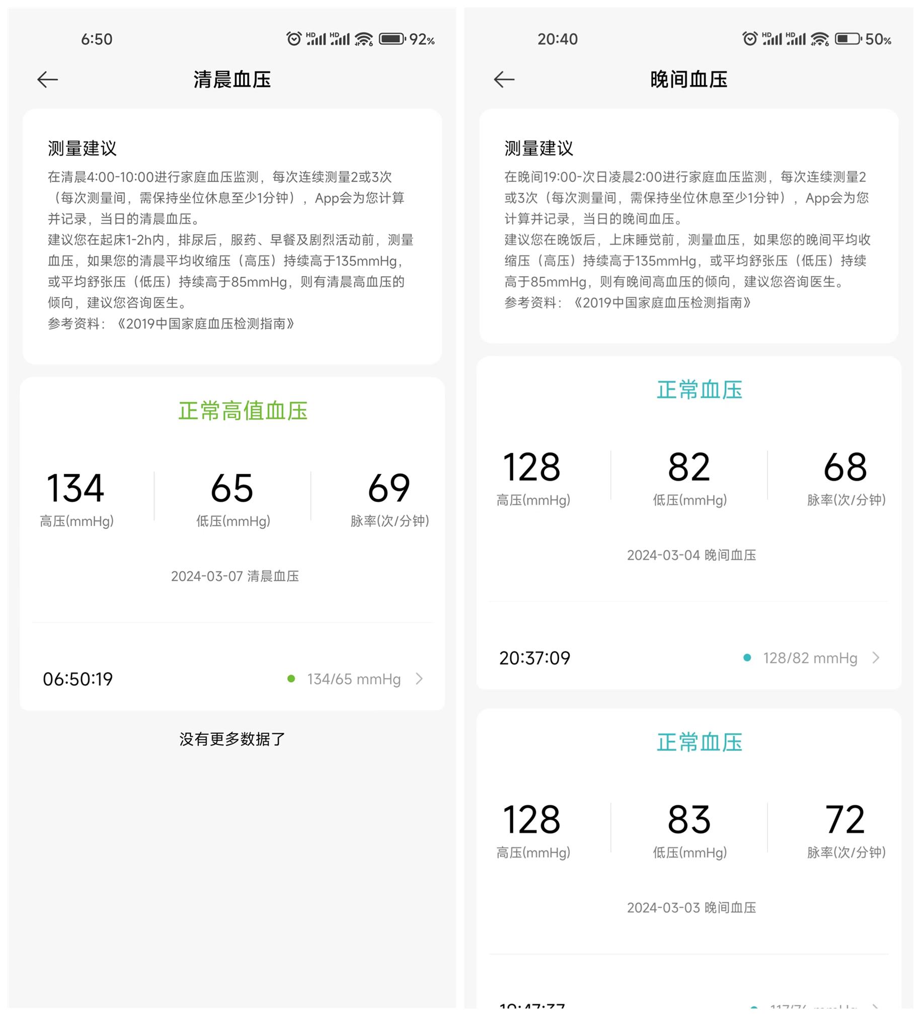 测量完成后屏幕上显示的内容依次是高压、低压、脉率,以及针对血压数据的评定指导,有高血压、正常偏高、正常血压三种。