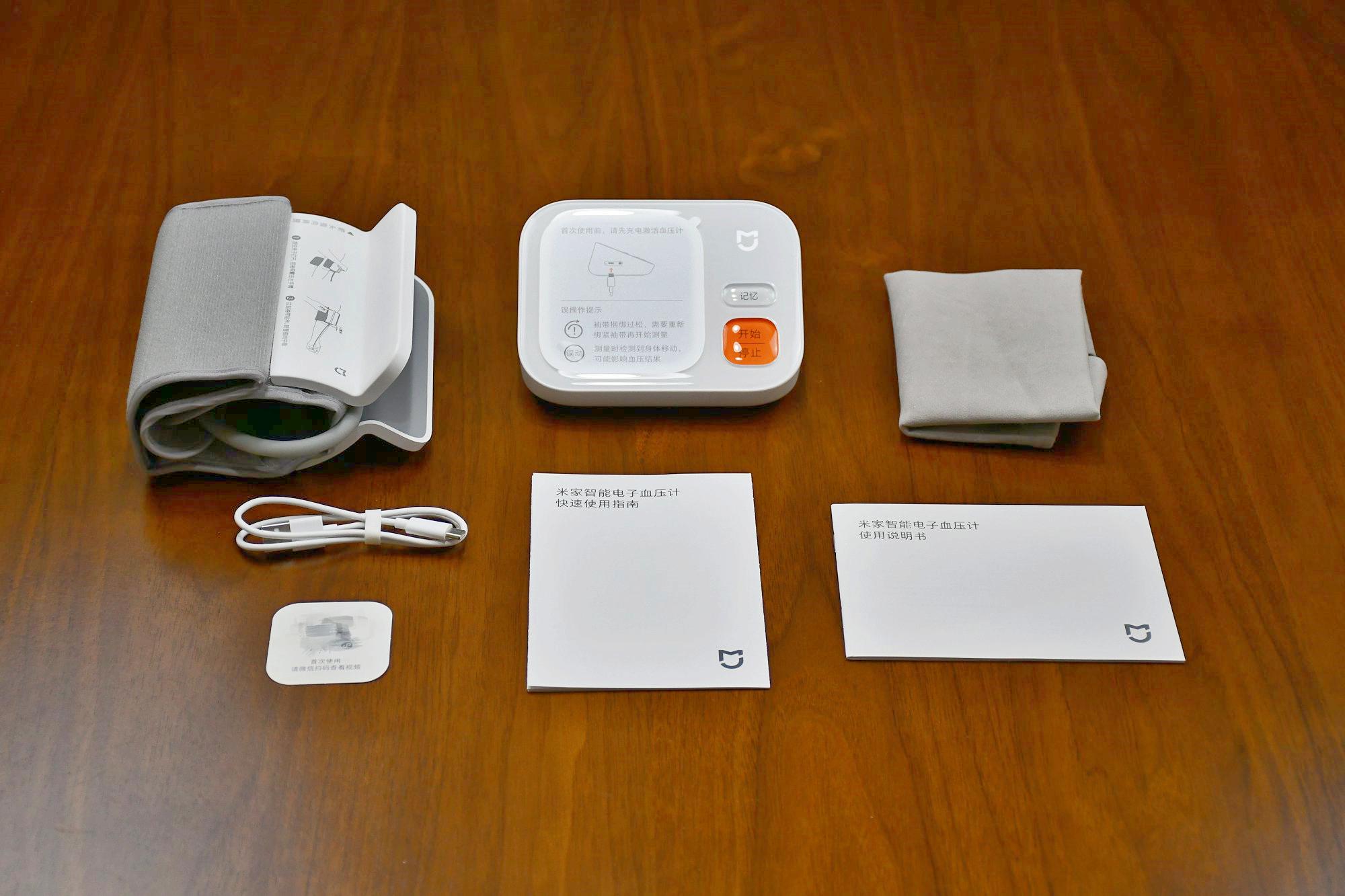 包装盒里装有7件物品,除了血压计主体组合套装外,还附带了一根USB-C的充电线和收纳袋,其余的是说明书、快速使用指南、扫码小程序卡。