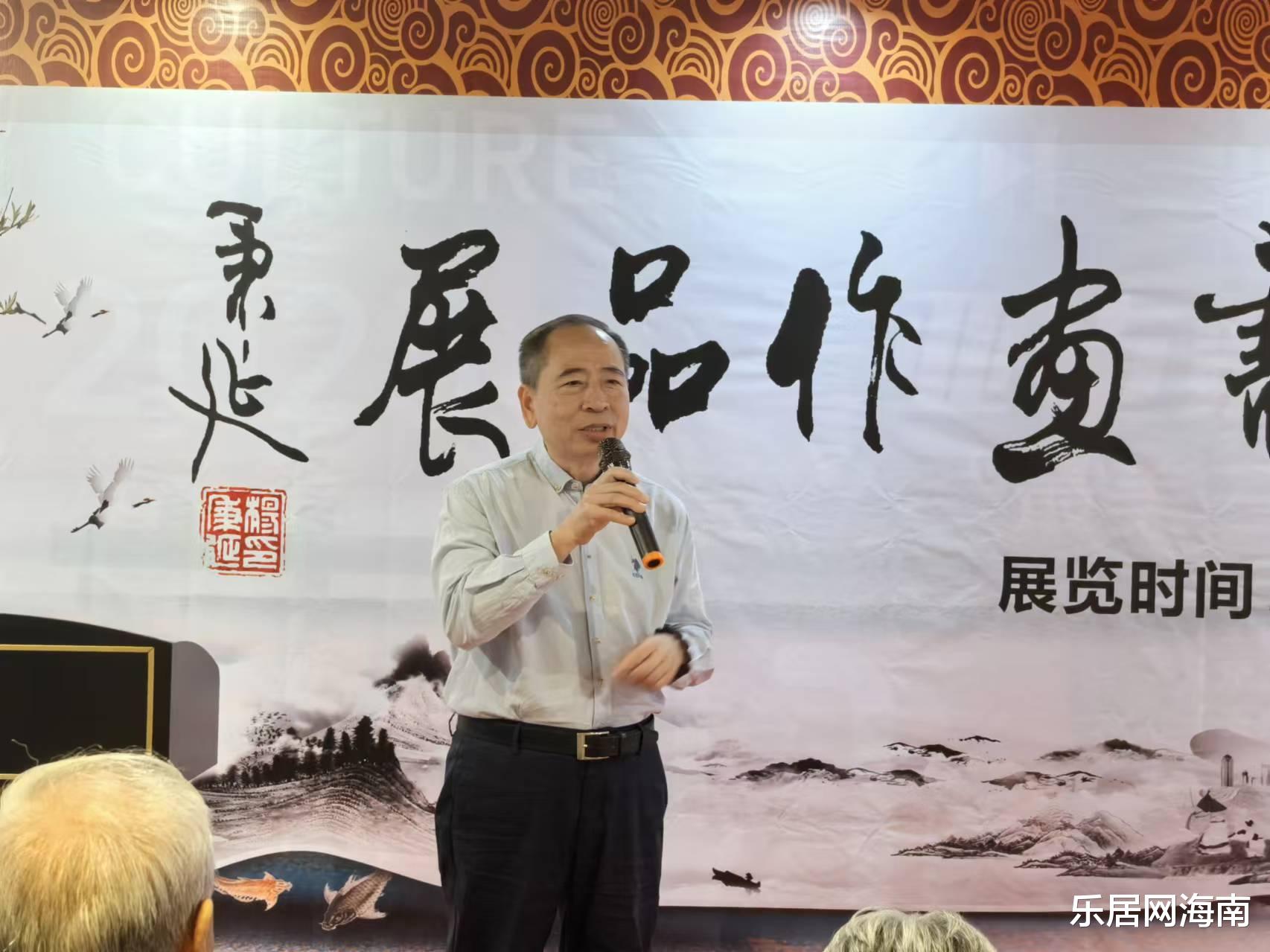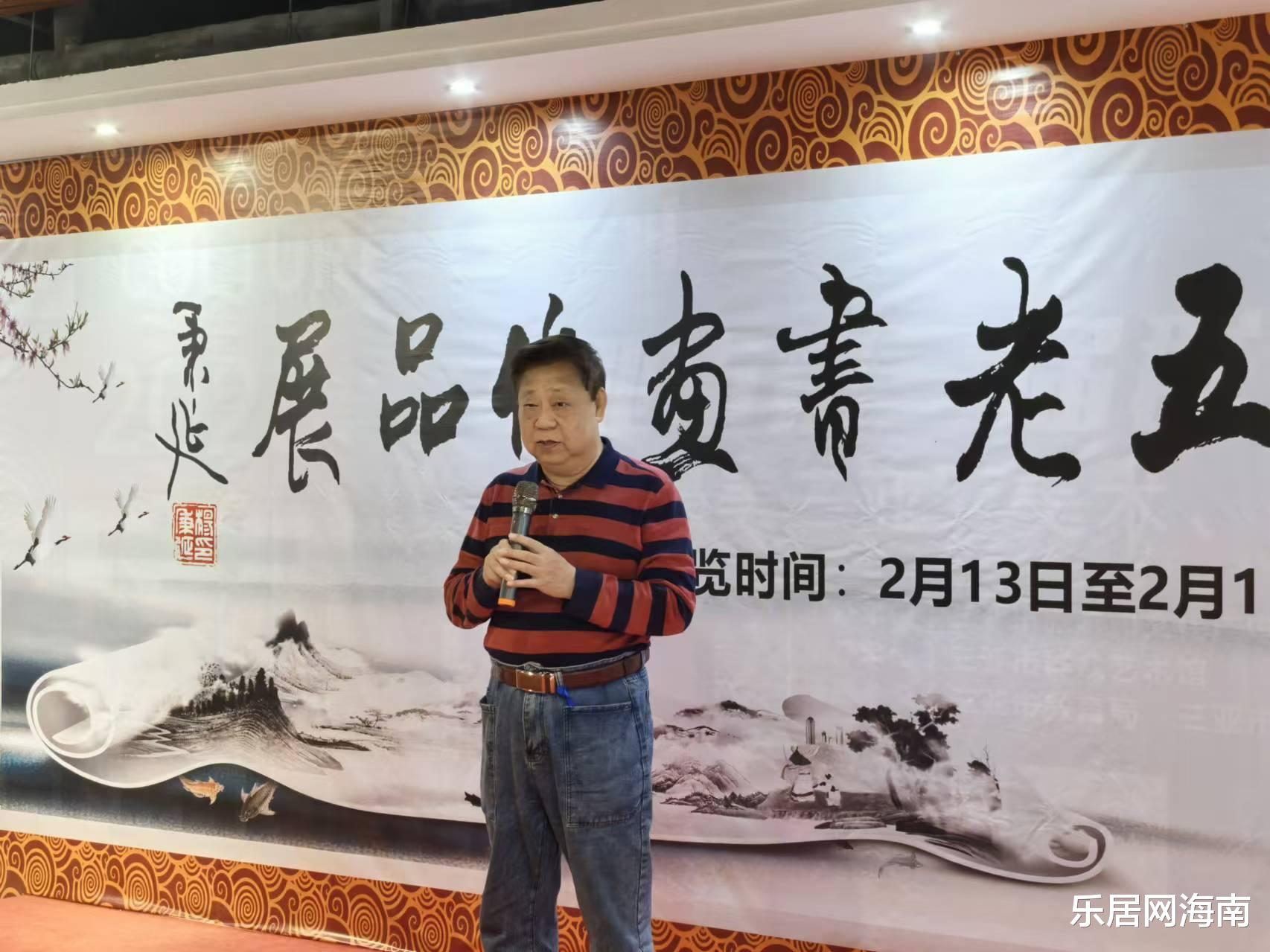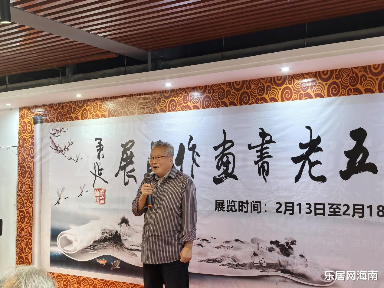 随后,三亚市委宣传部原副部长、二级巡视员邢洪彪先生登台发言。他结合海南自贸港建设背景,阐述了文化艺术在新时代的重要意义:“书画艺术是中华文化的瑰宝,也是连接历史与未来的纽带。五老的作品中既有传统笔墨的厚重,又透露出与时俱进的创新精神,这正是文化自信的生动体现。”邢洪彪呼吁社会各界共同支持传统文化传承,让艺术成为城市发展的精神动力。