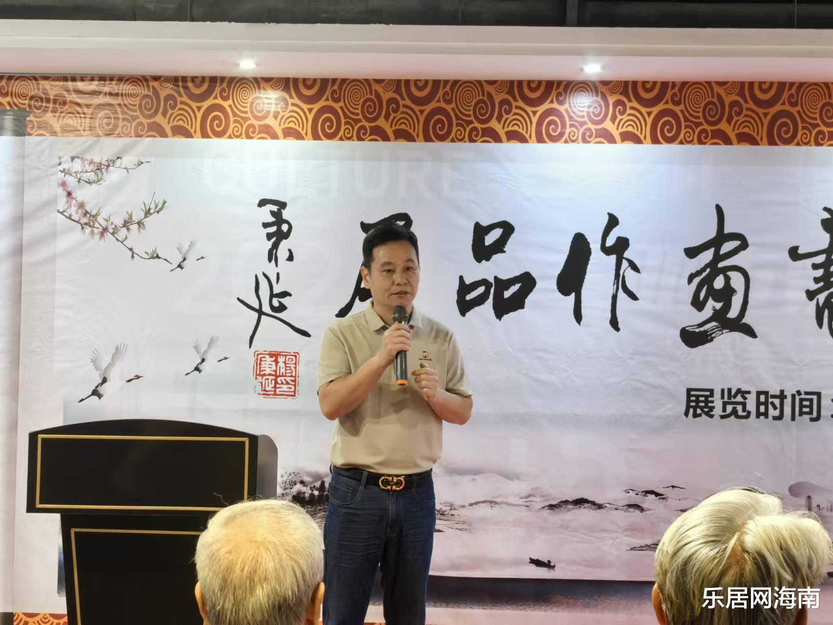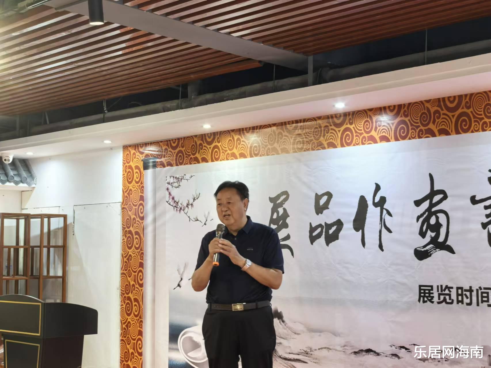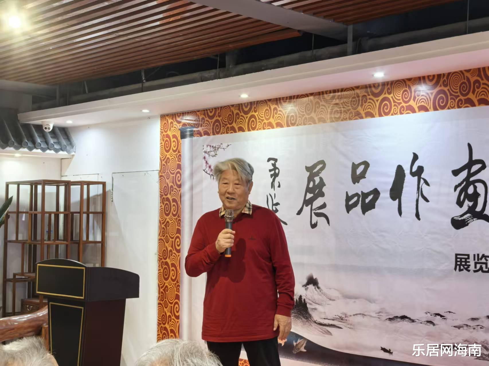 随后,三亚市委宣传部原副部长、二级巡视员邢洪彪先生登台发言。他结合海南自贸港建设背景,阐述了文化艺术在新时代的重要意义:“书画艺术是中华文化的瑰宝,也是连接历史与未来的纽带。五老的作品中既有传统笔墨的厚重,又透露出与时俱进的创新精神,这正是文化自信的生动体现。”邢洪彪呼吁社会各界共同支持传统文化传承,让艺术成为城市发展的精神动力。