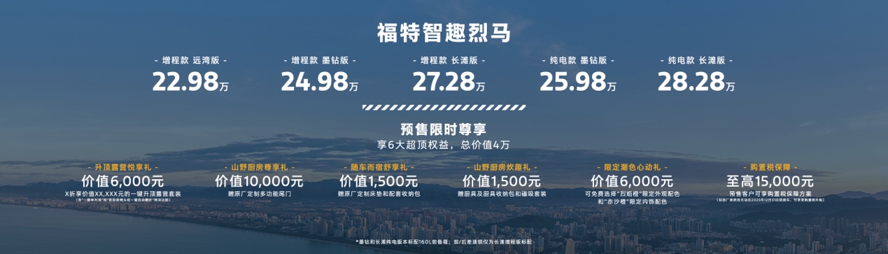 2025年11月18日浙江安吉,福特烈马家族首款新能源车型——福特智趣烈马正式开启预售!增程、纯电双动力齐发,增程版三款车型(远湾版22.98万、墨钻版24.98万、长滩版27.28万)坐拥1220公里CLTC综合续航;纯电版两款车型(墨钻版25.98万、长滩版28.28万)续航达650公里。预售期还送上6大尊享权益,含“升顶露营悦享礼”“山野厨房尊享礼”“购置税保障”等,总价值高达4万元,现在登录“福特纵横 Ford Beyond”小程序就能预订,解锁“可城、可玩、可野”的全场景出行乐趣。