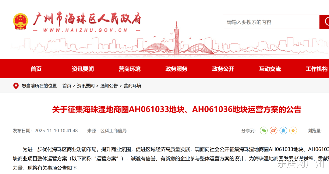 11月10日,海珠区科工商信局挂出公告,面向社会公开征集海珠湿地商圈两宗地块(AH061033、AH061036)运营方案。