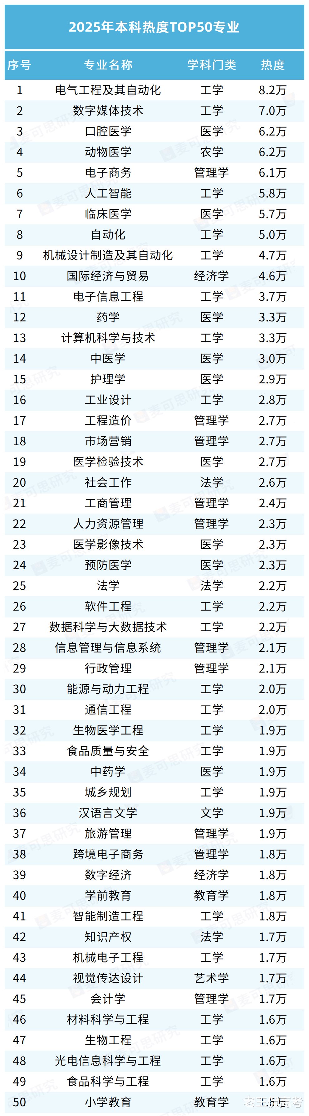 高考报考和录取工作正在火热进行中,而今年到底哪些本科专业最热门也是许多人想知道的,计算机、电子信息、电气、医学等等近年来的热门专业是否仍旧延续着它们的超高人气?文科有什么热门专业吗?根据百度热搜高考大数据平台的数据(截至2025年6月27日),2025年最热门的本科专业已经产生,它们依次是电气工程及其自动化、数字媒体技术、口腔医学、动物医学、电子商务、人工智能、临床医学、自动化、机械设计制造及其自动化、国际经济与贸易。本文就对比一下2024年和2025年的10大热门专业,看看它们发生了什么变化。(文末附2025年本科热度前50名专业名单)