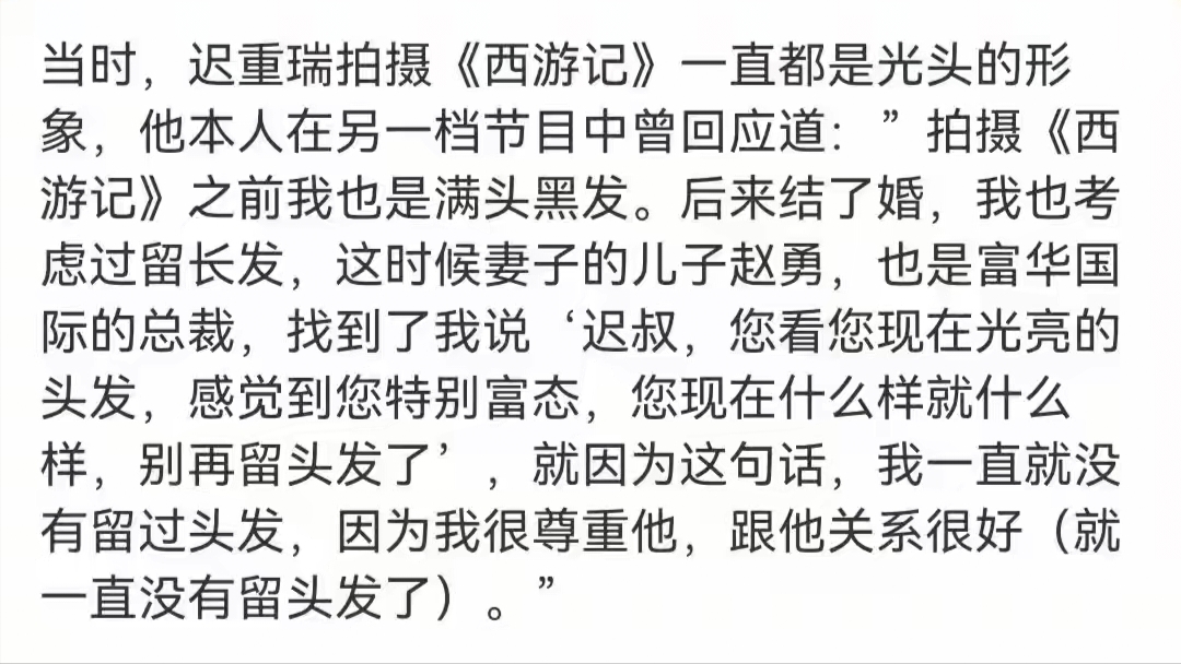 婚后,甚至因孩子一句“迟叔,你现在很富态就保持原样不变吧”就不再留发。