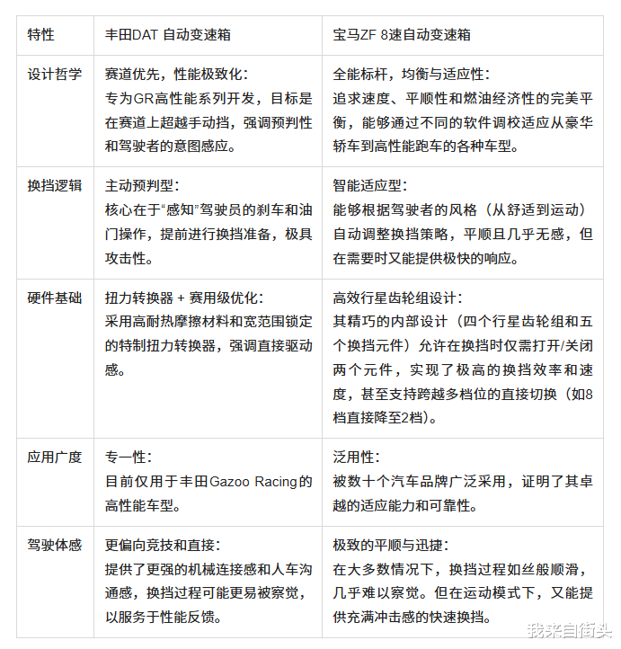 将丰田DAT与被誉为“神级”的宝马ZF 8速变速箱进行比较,可以发现两者在哲学和实现方式上既有共通之处,也存在显著差异。