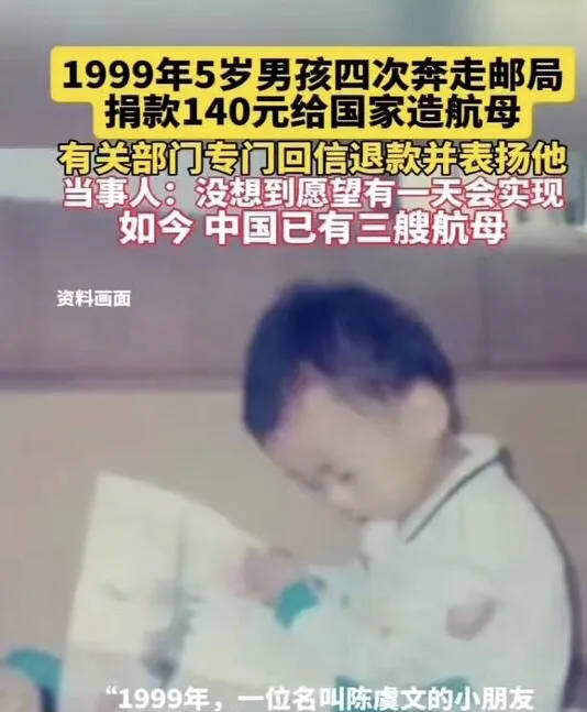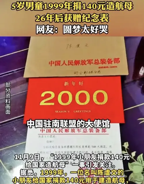 他把小猪存钱罐砸开,把硬币、毛票和幼儿园奖励的小红包全部倒在桌上,凑够140元,在父亲陪同下分四次跑进当地邮局,汇款单附言栏用稚拙笔迹写下“用于建造航空母舰”,收款人写“解放军总装备部”。
